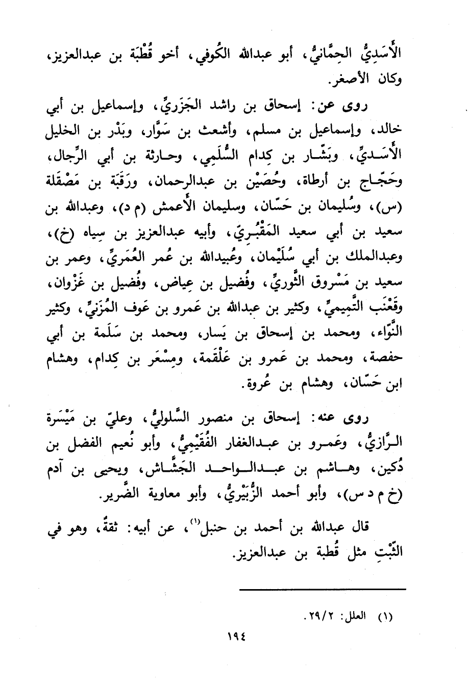قال عَبد اللَّه بْن أَحْمَد بْن حنبل (1) ، عَن أبيه: ثقة، وهو فِي الثبت مثل قطبة بْن عَبْد العزيز.