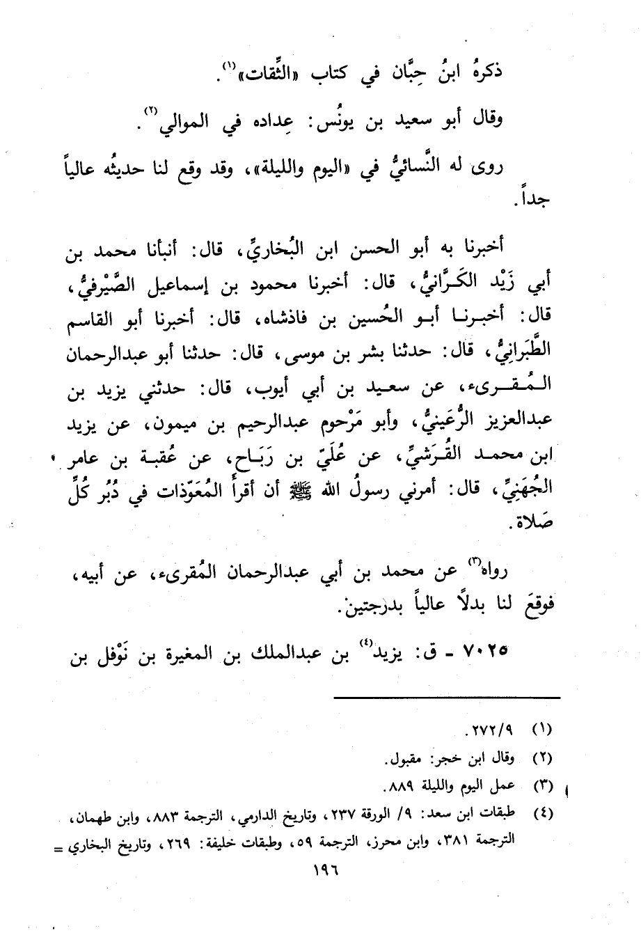 أَخْبَرَنَا بِهِ أبو الحسن بْن البخاري، قال: أَنْبَأَنَا مُحَمَّدُ بْنُ أَبي زَيْدٍ الْكَرَّانِيُّ، قال: أَخْبَرَنَا مَحْمُودُ بْنُ إِسْمَاعِيلَ الصَّيْرَفِيُّ، قال: أخبرنا أَبُو الْحُسَيْنِ بْنُ فَاذْشَاهِ، قال: أَخْبَرَنَا أَبُو الْقَاسِمِ الطَّبَرَانِيُّ، قال: حَدَّثَنَا بشر بْن موسى، قال: حَدَّثَنَا أَبُو عَبْدِ الرَّحْمَنِ الْمُقْرِئُ، عن سَعِيد بْنُ أَبي أَيُّوبَ، قال: حَدَّثَنِي يَزِيدُ بْنُ عَبْدِ الْعَزِيزِ الرُّعَيْنِيُّ، وأَبُو مَرْحُومٍ عَبد الرَّحِيمِ بن ميمون، عن يزيد ابن مُحَمَّدٍ الْقُرَشِيِّ، عَنْ عَلِيِّ بْنِ رَبَاحٍ، عَنْ عُقْبَةَ بْنِ عَامِرٍ الْجُهَنِيِّ، قال: أَمَرَنِي رَسُولُ اللَّهِ صَلَّى اللَّهُ عَلَيْهِ وسَلَّمَ إِنَّ أَقْرَأَ الْمُعَوِّذَاتِ فِي دُبُرِ كُلِّ صَلاةٍ.