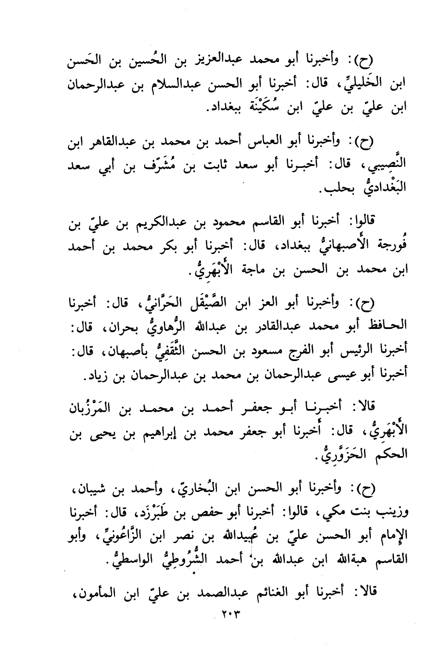 (ح) : وأخبرنا أَبُو الْعِزِّ ابن الصَّيْقَلِ الْحَرَّانِيُّ، قال: أخبرنا الْحَافِظُ أَبُو مُحَمَّدٍ عَبْدُ الْقَادِرِ بْنُ عَبد اللَّهِ الرُّهَاوِيُّ بِحَرَّانَ، قال: أَخْبَرَنَا الرَّئِيسُ أَبُو الْفَرَجِ مَسْعُودُ بْنُ الْحَسَنِ الثَّقَفِيُّ بِأَصْبَهَانَ، قال: أَخْبَرَنَا أَبُو عيسى عَبْد الرَّحْمَنِ بْن مُحَمَّد بْن عَبْد الرَّحْمَنِ بْنِ زِيَادٍ.