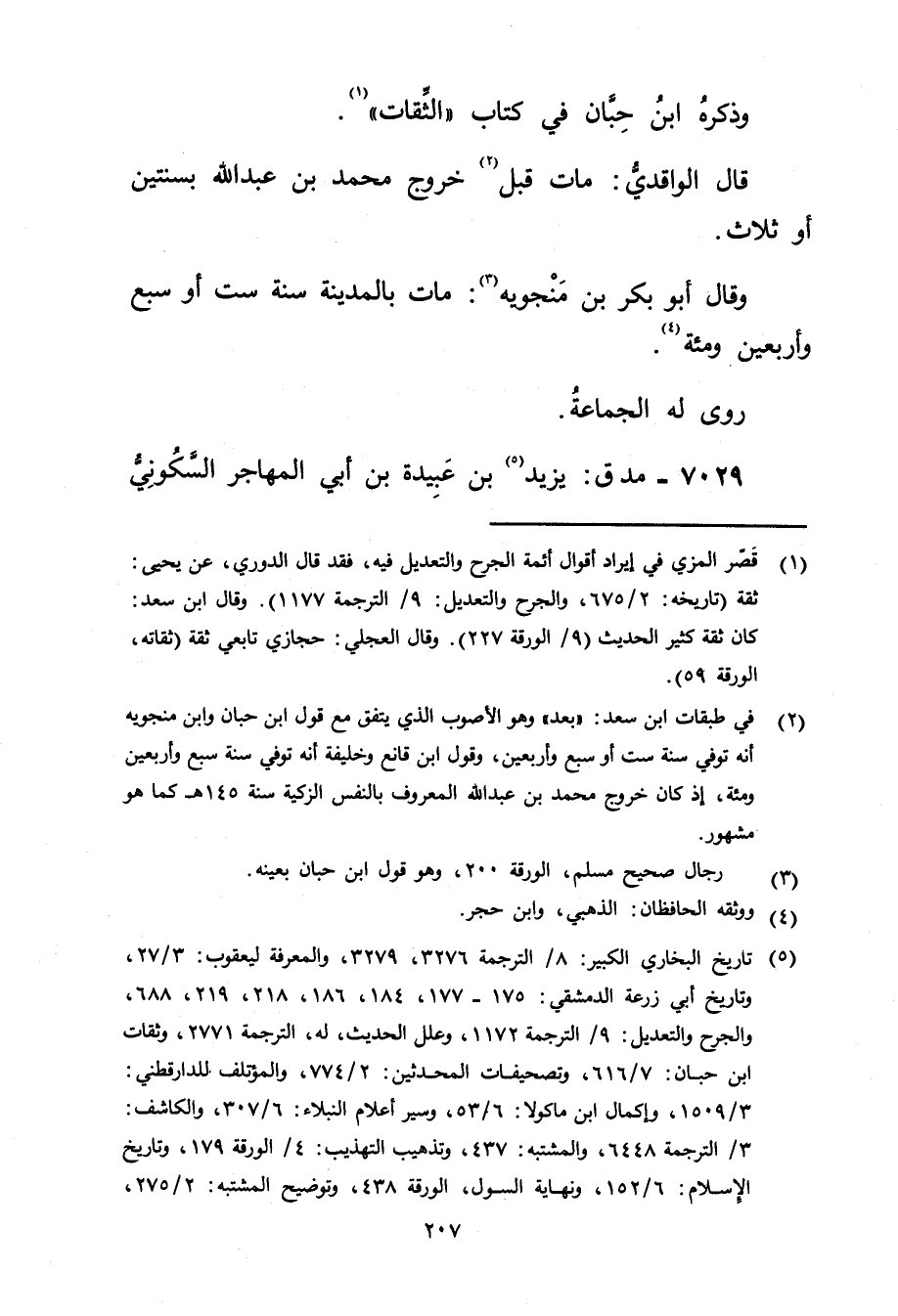 (2) في طبقات ابن سعد: بعد" وهو الاصوب الذي يتفق مع قول ابن حبان وابن منجويه أنه توفي سنة ست أو سبع وأربعين، وقول ابن قانع وخليفة أنه توفي سنة سبع وأربعين ومئة، إذ كان خروج محمد بن عَبد الله المعروف بالنفس الزكية سنة 145 هـ كما هو مشهور.