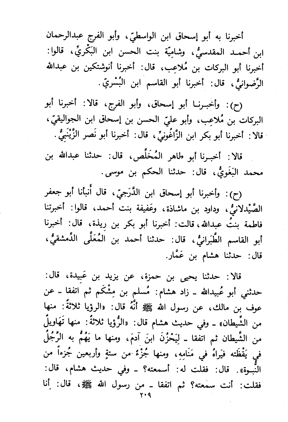 (ح) : وأخبرنا أَبُو إِسْحَاقَ ابْنُ الدَّرَجِيِّ، قال أَنْبَأَنَا أَبُو جعفر الصيدلاني، وداود بْن ماشاذة، وعفيفة بْنت أحمد، قَالُوا: أَخْبَرَتْنا فَاطِمَةُ بِنْتُ عَبد اللَّهِ، قَالَتْ: أخبرنا أَبُو بَكْرِ بْنِ رِيذَةَ، قال: أخبرنا أَبُو الْقَاسِمِ الطَّبَرَانِيُّ، قال: حَدَّثَنَا أَحْمَدُ بْنُ الْمُعَلَّى الدِّمَشْقِيُّ، قال: حَدَّثَنَا هِشَامُ بْنُ عَمَّارٍ.