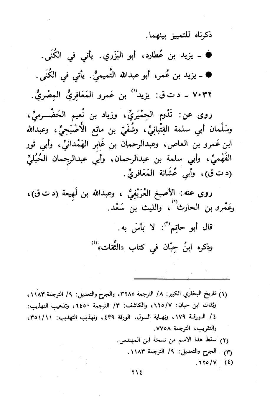(1) تاريخ البخاري الكبير: 8 / الترجمة 3285، والجرح والتعديل: 9 / الترجمة 1183، وثقات ابن حبان: 7 / 625، والكاشف: 3 / الترجمة 6450، وتذهيب التهذيب: 4 / الورقة 179، ونهاية السول، الورقة 439، وتهذيب التهذيب: 11 / 351، والتقريب، الترجمة 7758.