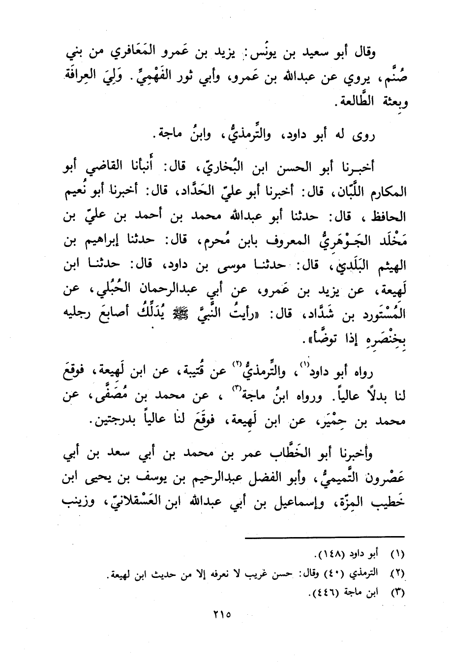 رَوَاهُ أَبُو دَاوُدَ (1) ، والتِّرْمِذِيّ (2) عن قتيبة، عن ابن لَهِيعَة، فَوَقَعَ لَنَا بَدَلا عَالِيًا. ورَوَاهُ ابْنُ مَاجَهْ (3) ، عن مُحَمَّدِ بْنِ مُصَفَّى، عَنْ مُحَمَّدِ بْنِ حِمْيَرٍ، عَنِ ابن لَهِيعَة، فوقع لنا عَالِيًا بِدَرَجَتَيْنِ.