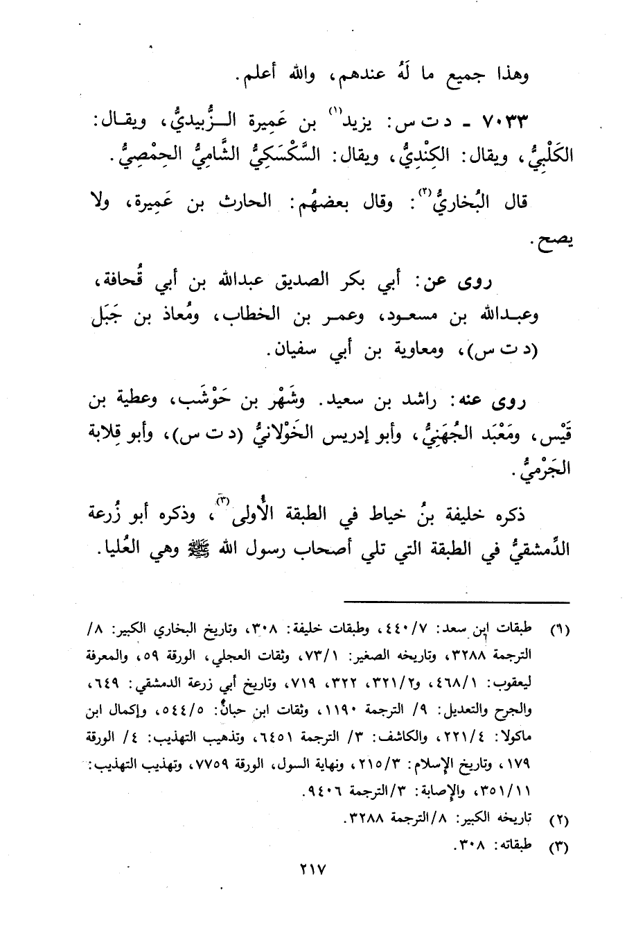 ذكره خليفة بْن خياط في الطبقة الأولى (3) ، وذكره أَبُو زُرْعَة الدمشقي فِي الطبقة التي تلي أصحاب رَسُول اللَّهِ صلى الله عليه وسلم وهي العليا.