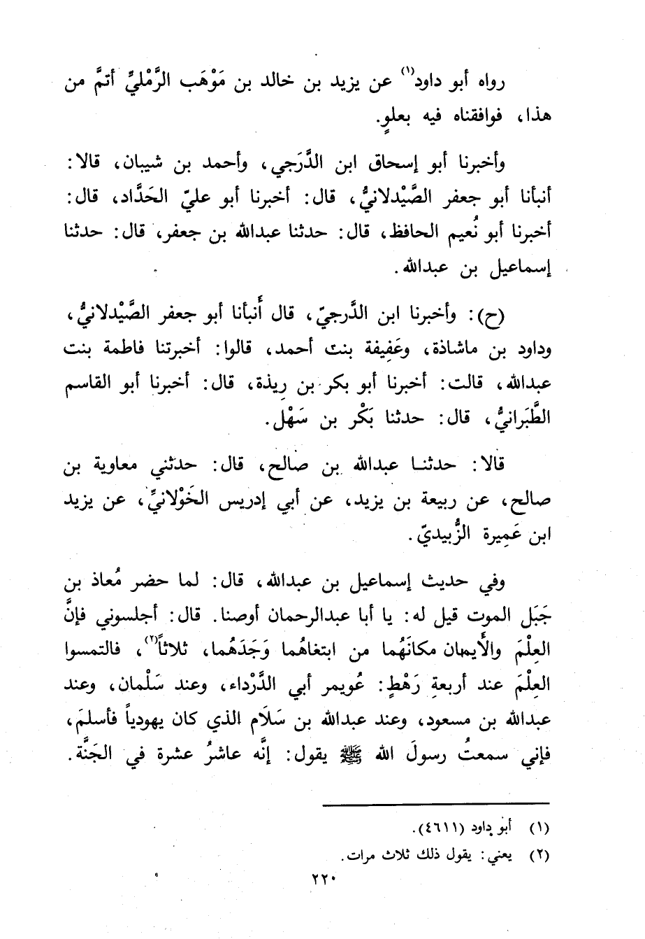 وفِي حَدِيثِ إِسْمَاعِيلَ بْن عَبد اللَّهِ، قال: لما حَضَرَ مُعَاذَ بْنَ جَبَلٍ الْمَوْتُ قِيلَ لَهُ: يَا أَبَا عَبْدِ الرَّحْمَنِ أَوْصِنَا. قال: أَجْلِسُونِي فَإِنَّ الْعِلْمَ والإِيمَانَ مَكَانَهُمَا مَنِ ابْتَغَاهُمَا وجَدَهُمَا، ثَلاثًا (2) ، فَالْتَمِسُوا الْعِلْمَ عِنْدَ أَرْبَعَةِ رَهْطٍ: عُوَيْمِرَ أَبي الدَّرْدَاء، وعِنْدَ سَلْمَانَ، وعِنْدَ عَبد اللَّهِ بْنِ مَسْعُودٍ، وعِنْدَ عَبد اللَّهِ بْنِ سَلامٍ الَّذِي كَانَ يَهُودِيًّا فَأَسْلَمَ، فَإِنِّي سَمِعْتُ رَسُولَ اللَّهِ صَلَّى اللَّهُ عَلَيْهِ وسَلَّمَ يقول: إِنَّهُ عَاشِرُ عَشَرَةٍ فِي الْجَنَّةِ.