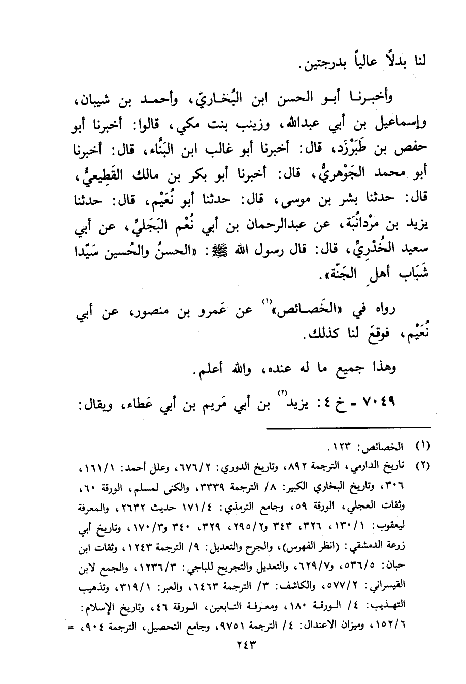وأَخْبَرَنَا أَبُو الْحَسَنِ بْنُ الْبُخَارِيِّ، وأحمد بْنُ شَيْبَانَ، وإِسْمَاعِيلُ بْنُ أَبي عَبد اللَّهِ، وزَيْنَبُ بِنْتُ مَكِّيٍّ، قَالُوا: أَخْبَرَنَا أَبُو حفص بْن طَبَرْزَذَ، قال: أخبرنا أَبُو غالب ابْن البناء، قال: أَخْبَرَنَا أبو مُحَمَّد الجوهري، قال: أَخْبَرَنَا أبو بكر بْن مالك القَطِيعِيّ، قال: حَدَّثَنَا بشر بْن موسى، قال: حَدَّثَنَا أَبُو نُعَيْمٍ، قال: حَدَّثَنَا يَزِيدُ بْنُ مَرْدَانُبَةَ، عَنْ عَبْدِ الرَّحْمَنِ بْنِ أَبي نُعْمٍ الْبَجَلِيِّ، عَن أَبِي سَعِيد الخُدْرِيّ، قال: قال رَسُول اللَّهِ صلى الله عليه وسلم: الْحَسَنُ والْحُسَيْنُ سَيِّدَا شَبَابِ أَهْلِ الْجَنَّةِ.