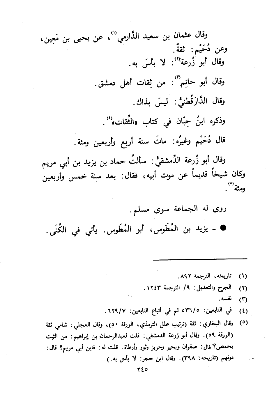 (5) وقَال البُخارِيُّ: ثقة (ترتيب علل التِّرْمِذِيّ، الورقة 50) ، وَقَال العجلي: شامي ثقة