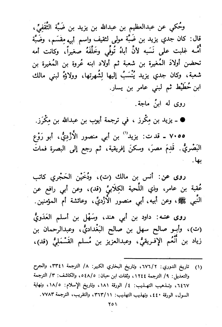 (1) تاريخ الدوري: 2 / 676، وتاريخ البخاري الكبير: 8 / الترجمة 3341، والجرح والتعديل: 9 / الترجمة 1244، وثقات ابن حبان: 5 / 548، والكاشف: 3 / الترجمة 6467، وتذهيب التهذيب: 4 / الورقة 181، وتاريخ الاسلام: 5 / 18، ونهاية السول، الورقة 440، وتهذيب التهذيب: 11 / 363، والتقريب، الترجمة 7783.