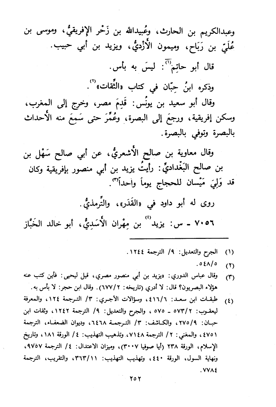 (3) وَقَال عَباس الدُّورِيُّ: يزيد بن أَبي منصور مصري، قيل ليحيى: فأين كتب عنه هؤلاء البَصْرِيّون؟ قال: لا أدري (تاريخه: 2 / 677) . وَقَال ابن حجر: لا بأس به.