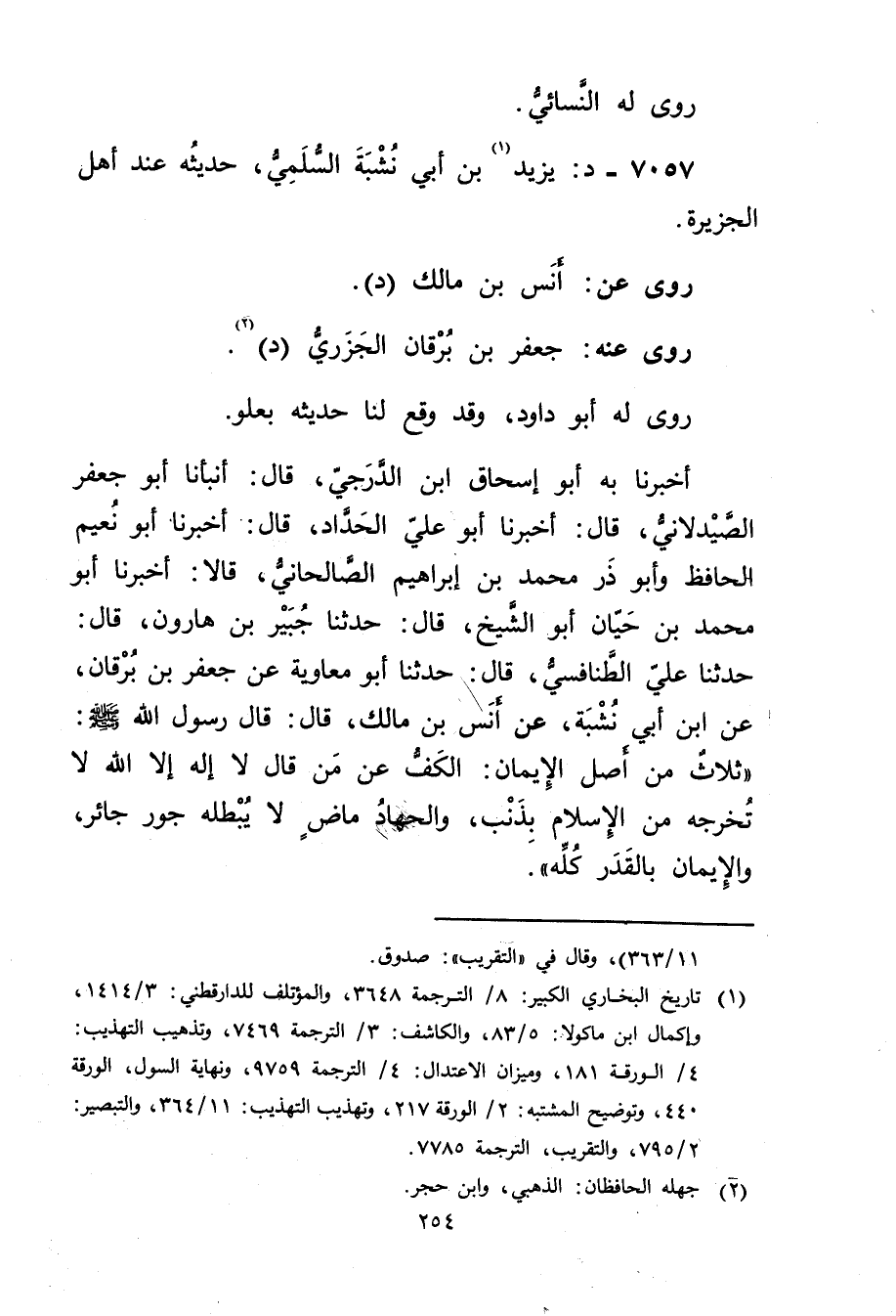 مُحَمَّد بْن حيان أَبُو الشيخ، قال: حَدَّثَنَا جُبَيْرُ بْنُ هَارُونَ، قال: حَدَّثَنَا عَلِيُّ الطَّنَافِسِيُّ، قال: حَدَّثَنَا أَبُو مُعَاوِيَةَ عَنْ جَعْفَرِ بْنِ بُرْقَانَ، عَنِ ابْنِ أَبي نُشْبَةَ، عَنْ أَنَسِ بْنِ مَالِكٍ، قال: قال رَسُولُ اللَّهِ صلى اللَّهُ عَلَيْهِ وسَلَّمَ: ثَلاثٌ مَنْ أَصْلِ الإِيمَانِ: الْكَفُّ عَنْ مَنْ قال لا إله إلا الله لا تُخْرِجُهُ مِنَ الإِسْلامِ بِذَنْبٍ، والْجِهَادُ مَاضٍ لا يُبْطِلُهُ جَوْرُ جائر، والايمان بالقدر كله.