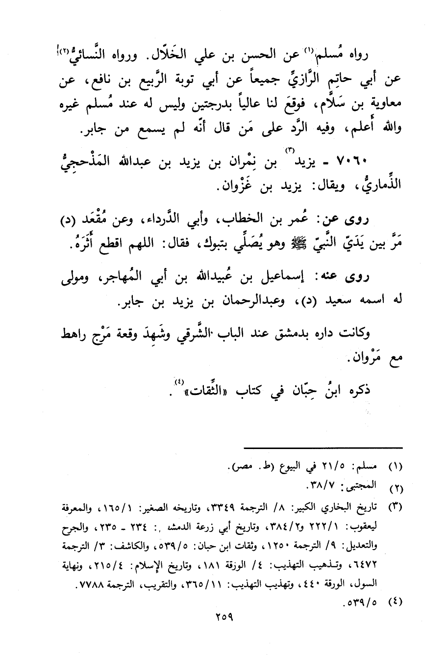 (3) تاريخ البخاري الكبير: 8 / الترجمة 3349، وتاريخه الصغير: 1 / 165، والمعرفة ليعقوب: 1 / 22 و2 / 384، وتاريخ أبي زرعة الدمشقي: 234 - 235، والجرح والتعديل: 9 / الترجمة 1250، وثقات ابن حبان: 5 / 539، والكاشف: 3 / الترجمة 6472، وتذهيب التهذيب: 4 / الورقة 181، وتاريخ الاسلام: 4 / 215، ونهاية السول، الورقة 440، وتهذيب التهذيب: 11 / 365، والتقريب، الترجمة 7788.