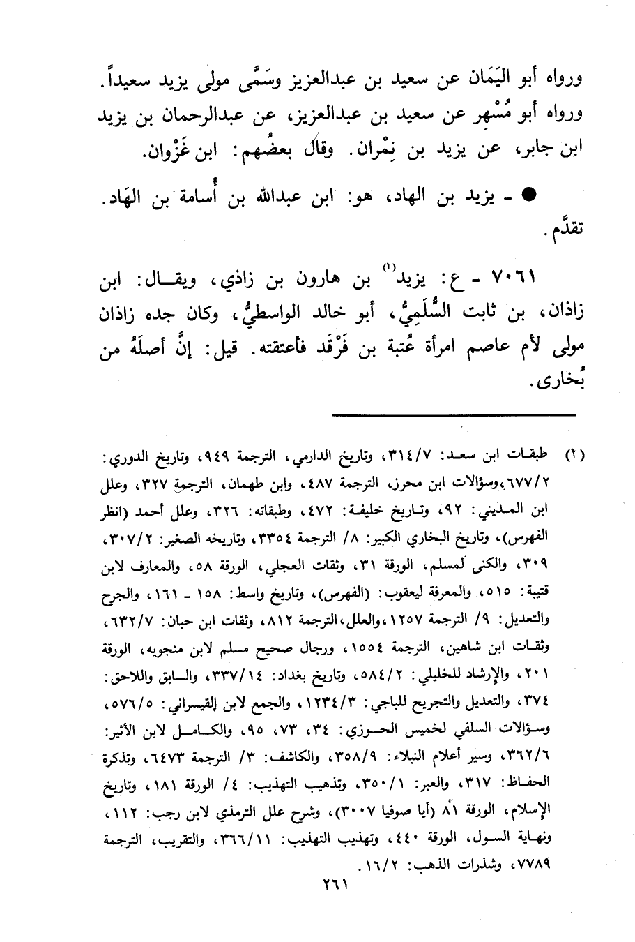 7016 - ع: يزيد بن هارون بن زاذي (1) ، ويُقال: ابْن زاذان، بْن ثابت السلمي، أَبُو خالد الواسطي، وكان جده زاذان مولى لأُم عاصم امرأة عتبة بْن فرقد فأعتقته. قيل: إن أصله من بخارى.