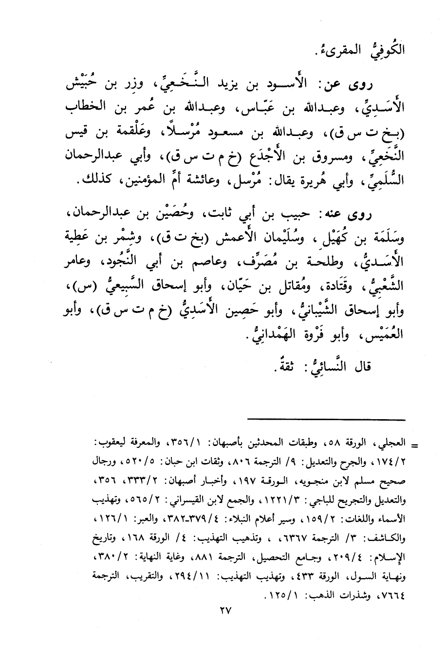 = العجلي، الورقة 58، وطبقات المحدثين بأصبهان: 1 / 356، والمعرفة ليعقوب: 2 / 174، والجرح والتعديل: 9 / الترجمة 806، وثقات ابن حبان: 5 / 520، ورجال صحيح مسلم لابن منجويه، الورقة 197، وأخبار أصبهان: 2 / 333، 356، والتعديل والتجريح للباجي: 3 / 1221، والجمع لابن القيسراني: 2 / 565، وتهذيب الأَسماء واللغات: 2 / 159، وسير أعلام النبلاء: 4 / 379 - 382، والعبر: 1 / 126، والكاشف: 3 / الترجمة 6367، وتذهيب التهذيب: 4 / الورقة 168، وتاريخ الاسلام: 4 / 209، وجامع التحصيل، الترجمة 881، وغاية النهاية: 2 / 380، ونهاية السول، الورقة 433، وتهذيب التهذيب: 11 / 294، والتقريب، الترجمة 7664، وشذرات الذهب: 1 / 125.