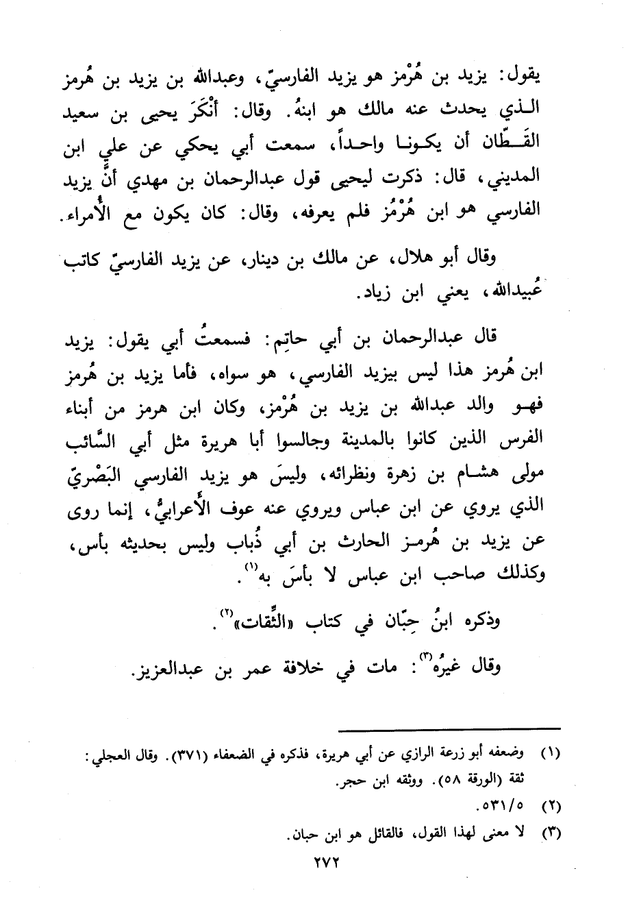 قال عَبْد الرحمن بْن أَبي حاتم: فسمعت أَبِي يقول: يزيد ابن هرمز هذا ليس بيزيد الفارسي، هو سواه، فأما يزيد بْن هرمز فهو والد عَبد اللَّهِ بْن يزيد بْن هرمز، وكان ابْن هرمز من أبناء الفرس الذين كانوا بالمدينة وجالسوا أَبَا هُرَيْرة مثل أَبِي السائب مولى هشام بْن زهرة ونظرائه، وليس هو يزيد الفارسي البَصْرِيّ الذي يروي عَن ابْن عباس ويروي عنه عوف الأعرابي، إنما روى عن يزيد بْن هرمز الحارث بْن أَبي ذباب وليس بحديثه بأس، وكذلك صاحب ابْن عباس لا بأس به (1) .