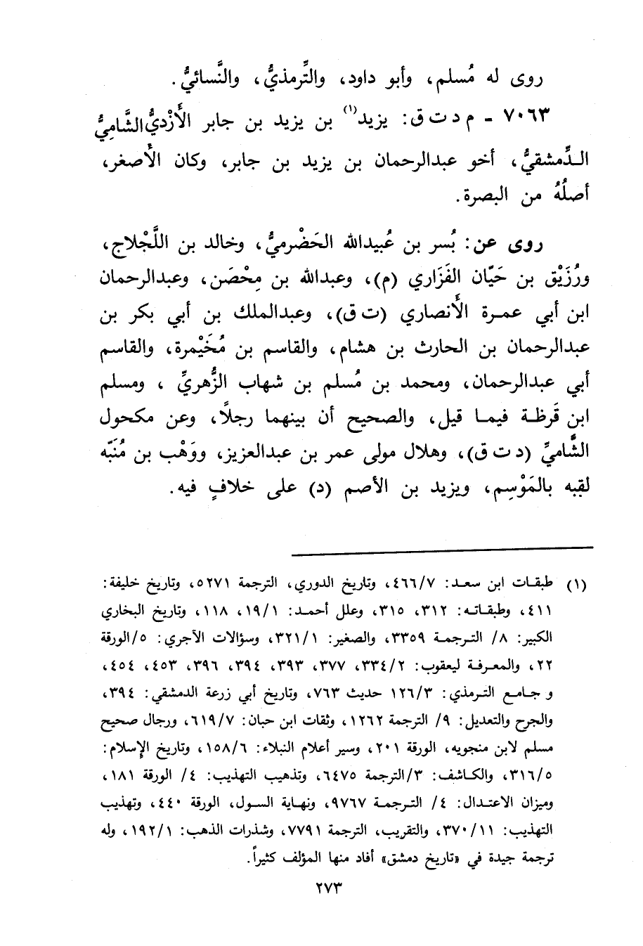 7063 - م د ت ق: يزيد بن يَزِيدَ بن جابر الأزدي الشامي الدمشقي (1) ، أخو عبد الرحمن بْن يزيد بْن جابر، وكان الأصغر، أصله من البصرة.