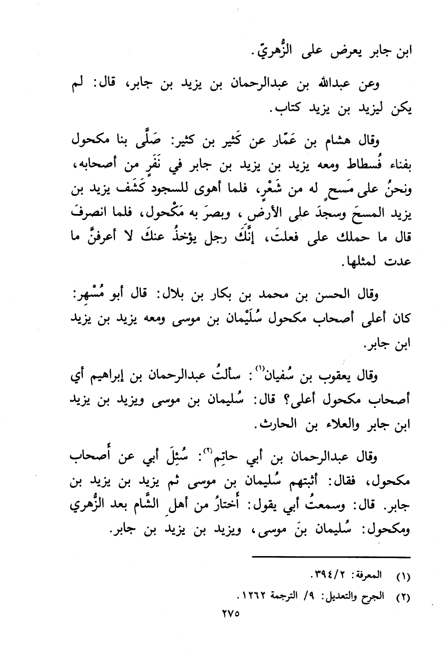 وَقَال عَبْد الرَّحْمَنِ بْن أَبي حَاتِم (2) : سئل أَبِي عَن أصحاب مكحول، فقال: أثبتهم سُلَيْمان بْن موسى ثم يزيد بْن يزيد بْن جابر. قال: وسمعت أَبِي يقول: أختار من أهل الشام بعد الزُّهْرِيّ ومكحول: سُلَيْمان بْن موسى، ويزيد بْن يزيد بْن جابر.
