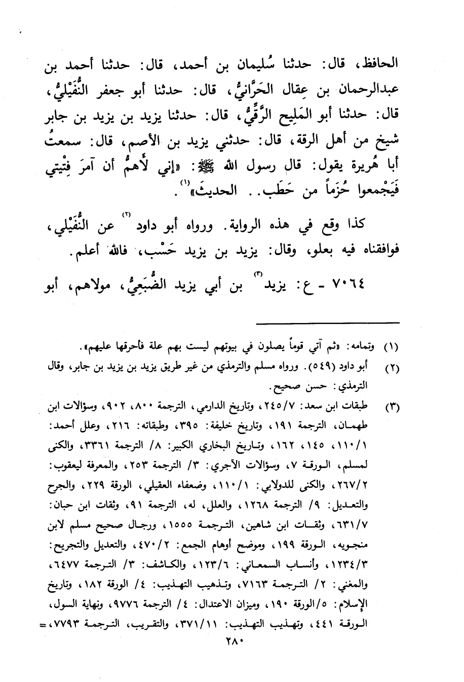 الْحَافِظُ، قال: حَدَّثَنَا سُلَيْمان بْنُ أَحْمَدَ، قال: حَدَّثَنَا أَحْمَدُ بْنُ عَبْدِ الرَّحْمَنِ بْنِ عِقَالٍ الْحَرَّانِيُّ، قال: حَدَّثَنَا أَبُو جَعْفَرٍ النُّفَيْلِيُّ، قال: حَدَّثَنَا أَبُو الْمَلِيحِ الرَّقِّيّ، قال: حَدَّثَنَا يَزِيدُ بْنُ يَزِيدَ بْنِ جَابِرٍ شَيْخٌ مِنْ أَهْلِ الرِّقَّةِ، قال: حَدَّثَنِي يَزِيدُ بْنُ الأَصَّمِ، قال: سَمِعْتُ أَبَا هُرَيْرة يقول: قال رَسُول اللَّهِ صَلَّى الله عليه وسلم: إِنِّي لأَهُمُّ أَنْ آمُرَ فِتْيَتِي فَيَجْمَعُوا حُزَمًا مِنْ حَطَبٍ..الْحَدِيثَ" (1) .