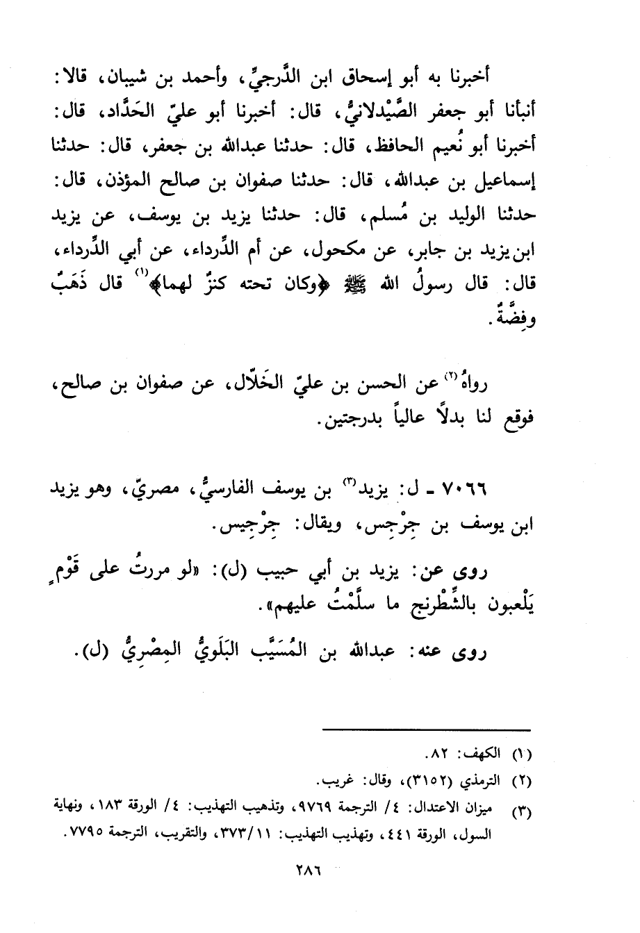 أَخْبَرَنَا بِهِ أَبُو إِسْحَاقَ ابْنُ الدَّرَجِيِّ، وأَحْمَدُ بْنُ شَيْبَانَ، قَالا: أَنْبَأَنَا أَبُو جَعْفَرٍ الصَّيْدَلانِيُّ، قال أَخْبَرَنَا أَبُو عَلِيّ الحداد، قال: أَخْبَرَنَا أَبُو نُعَيْمٍ الْحَافِظُ، قال: حَدَّثَنَا عَبد اللَّهِ بْن جَعْفَرٍ، قال: حَدَّثَنَا إِسْمَاعِيلُ بْنُ عَبد اللَّهِ، قال: حَدَّثَنَا صَفْوَانُ بْنُ صَالِحٍ الْمُؤَذِّنُ، قال: حَدَّثَنَا الْوَلِيدُ بْنُ مُسْلِمٍ، قال: حَدَّثَنَا يَزِيدُ بْنُ يُوسُفَ، عَنْ يَزِيدَ ابن يَزِيدَ بْنِ جَابِرٍ، عَنْ مَكْحُولٍ، عن أم الدرداء، عَن أبي الدرداء، قال: قال رَسُولُ اللَّهِ صَلَّى اللَّهُ عَلَيْهِ وسَلَّمَ (وكَانَ تَحْتَهُ كَنْزٌ لَهُمَا) (1) قال ذَهَبٌ وفِضَّةٌ.