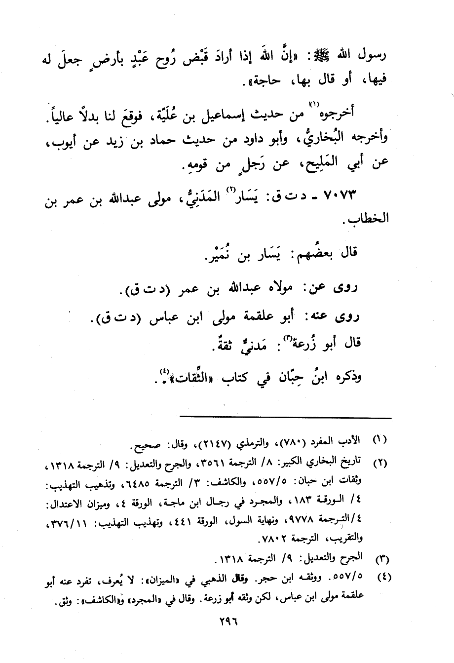 (4) 5 / 557. ووثقه ابن حجر. وَقَال الذهبي في " الميزان": لا يعرف، تفرد عنه أبو علقمة مولى ابن عباس، لكن وثقه أبو زُرْعَة. وَقَال في " المجرد" و" الكاشف": وثق.