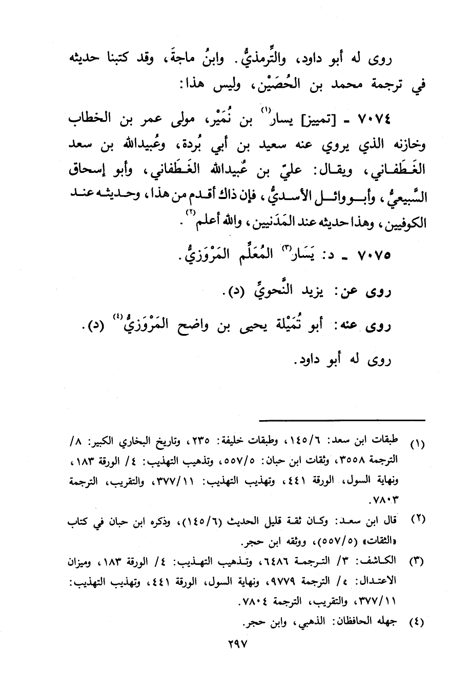 (3) الكاشف: 3 / الترجمة 6486، وتذهيب التهذيب: 4 / الورقة 183، وميزان الاعتدال: 4 / الترجمة 9779، ونهاية السول، الورقة 441، وتهذيب التهذيب: 11 / 377، والتقريب، الترجمة 7804.