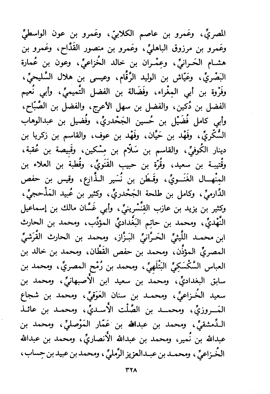 المِصْرِي، وعَمْرو بْن عاصم الكِلابي، وعَمْرو بْن عون الواسطي وعَمْرو بْن مرزوق الباهلي، وعَمْرو بْن منصور القداح، وعَمْرو بْن هشام الحراني، وعِمْران بْن خالد الخزاعي، وعون بْن عمارة البَصْرِيّ، وعياش بْن الوليد الرقام، وعيسى بْن هلال السليحي، وفروة بْن أَبي المغراء، وفضالة بْن الفضل التميمي، وأبي نعيم الفضل بْن دكين، والفضل بْن سهل الأعرج، والفضل بْن الصباح، وأبي كامل فضيل بْن حسين الجحدري، وفضيل بْن عَبْد الوهاب السكري، وفهد بْن حيان، وفهد بْن عوف، والقاسم بْن زكريا بْن دينار الكوفي، والقاسم بْن سلام بْن مسكين، وقبيصة بْن عقبة، وقتيبة بْن سَعِيد، وقرة بْن حبيب القنوي، وقطبة بْن العلاء بْن