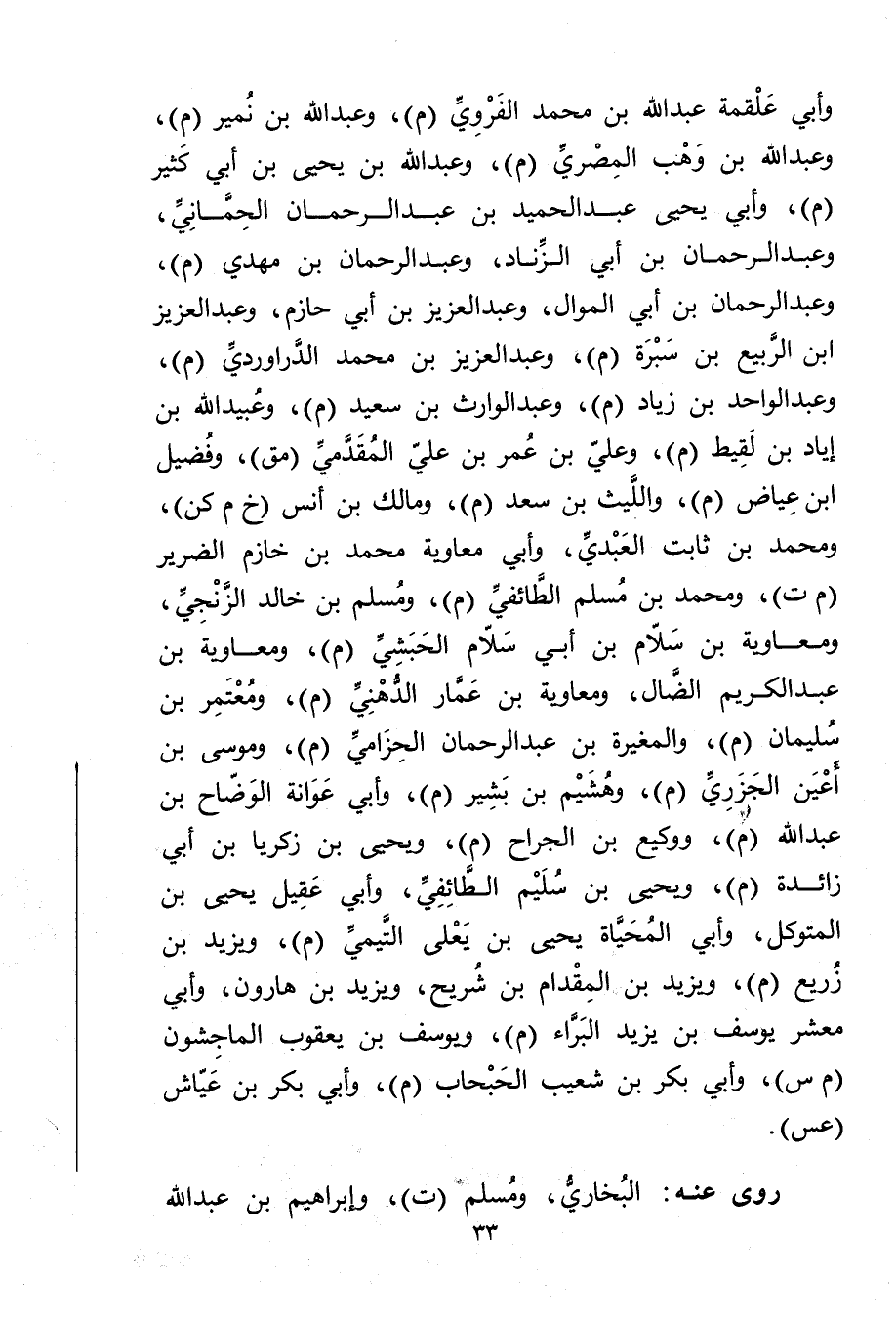 وأبي عَلْقَمَة عَبد اللَّهِ بْن مُحَمَّد الفروي (م) ، وعَبد اللَّهِ بن نمير (م) ، وعَبد اللَّهِ بْن وهب المِصْرِي (م) ، وعَبد اللَّهِ بْن يَحْيَى بْن أَبي كثير (م) ، وأبي يحيى عبد الحميد بْن عَبْد الرحمن الحماني، وعبد الرحمن بْن أَبي الزناد، وعبد الرحمن بْن مهدي (م) ، وعبد الرحمن بْن أَبي الموال، وعبد العزيز بْن أَبي حازم، وعبد العزيز ابن الربيع بْن سبرة (م) ، وعبد العزيز بْن مُحَمَّد الدَّراوَرْدِيّ (م) ، وعَبْد الْوَاحِدِ بْن زياد (م) ، وعبد الوارث بْن سَعِيد (م) ، وعُبَيد الله بْن إياد بْن لقيط (م) ، وعلي بْن عُمَر بْن علي المقدمي (مق) ، وفضيل ابن عياض (م) ، والليث بْن سعد (م) ، ومالك بن أنس (خ م كن) ، ومحمد بْن ثابت العبدي، وأبي معاوية مُحَمَّد بْن خازم الضرير (م ت) ، ومحمد بْن مسلم الطائفي (م) ، ومسلم بْن خالد الزنجي، ومعاوية بْن سلام بْن أَبي سلام الحبشي (م) ، ومعاوية بْن عَبْدِ الكريم الضال، ومعاوية بْن عمار الدهني (م) ، ومعتمر بْن سُلَيْمان (م) ، والمغيرة بْن عبد الرحمن الحزامي (م) ، وموسى بْن أعين الجزري (م) ، وهشيم بْن بشير (م) ، وأبي عوانة الوضاح بْن عَبد اللَّهِ (م) ، ووكيع بْن الجراح (م) ، ويحيى بن زكريا بن أَبي زائدة (م) ، ويحيى بْن سليم الطائفي، وأبي عقيل يَحْيَى بْن المتوكل، وأبي المحياة يحيى بْن يَعْلَى التَّيْمِيّ (م) ، ويزيد بْن زريع (م) ، ويزيد بْن المقدام بْن شريح، ويزيد بْن هارون، وأَبِي معشر يوسف بْن يزيد البراء (م) ، ويوسف بْن يعقوب الماجشون (م س) ، وأبي بكر بْن شعيب الحبحاب (م) ، وأبي بَكْرِ بْن عياش (عس) .