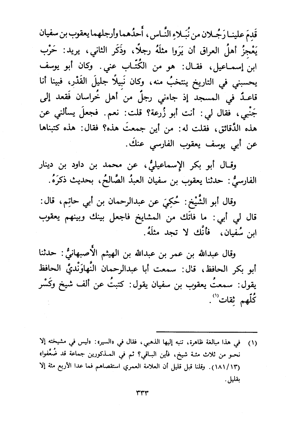 وَقَال عَبد اللَّهِ بْنُ عُمَر بْن عَبد اللَّهِ بْن الهيثم الأصبهاني: حَدَّثَنَا أَبُو بكر الحافظ، قال: سمعت أَبَا عَبْد الرحمن النهاوندي الحافظ يقول: سمعت يعقوب بْن سفيان يَقُول: كتبت عَنْ ألف شيخ وكسر كلهم ثقات (1) .