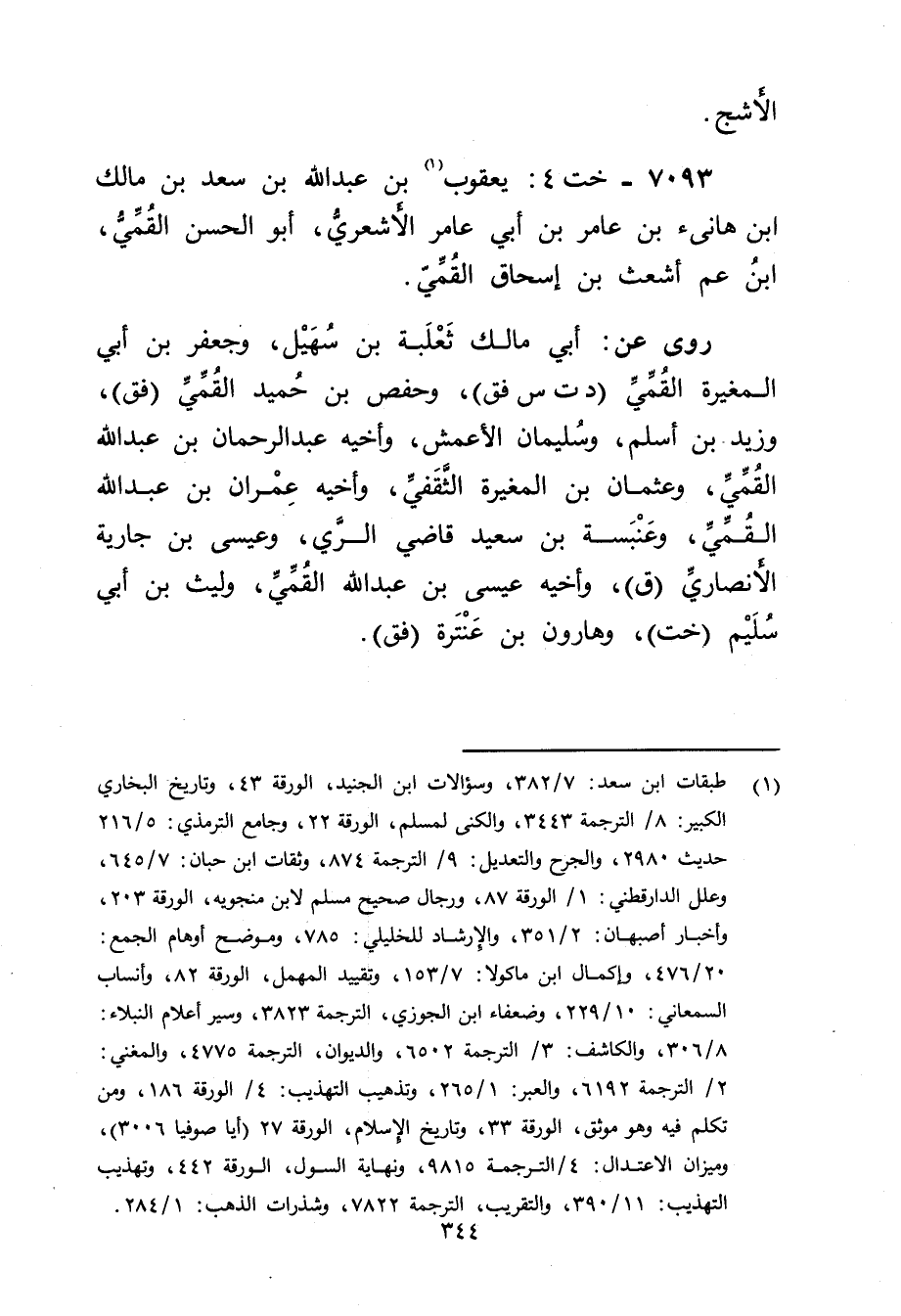 7093 - خت 4: يَعْقُوبُ بن عَبد اللَّهِ بن سَعْدِ بن مَالِكِ ابْنِ هَانِئِ بن عَامِرِ بن أَبي عَامِرٍ الأَشْعَرِي (1) ، أَبُو الحسن القمي، ابْن عم أشعث بْن إسحاق القمي.