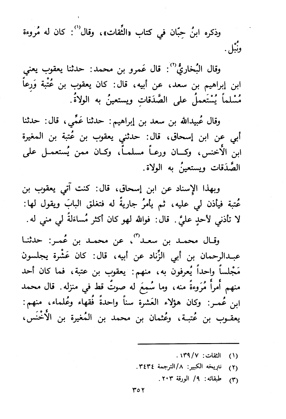 وقَال البُخارِيُّ (2) : قال عَمْرو بْن مُحَمَّد: حَدَّثَنَا يعقوب يعني ابْن إِبْرَاهِيم بْن سعد، عَن أبيه، قال: كَانَ يعقوب بْن عتبة ورعا مسلما يستعمل على الصدقات ويستعين بِهِ الولاة.