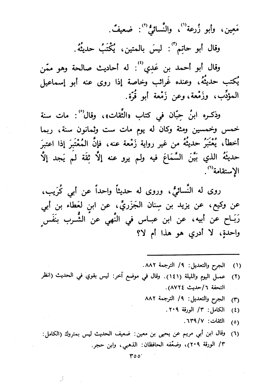 (6) وَقَال ابْن أَبي مريم عن يَحْيَى بن مَعِين: ضعيف الحديث ليس بمتروك (الكامل: 3 / الورقة 209) ، وضعفه الحافظان: الذهبي، وابن حجر.