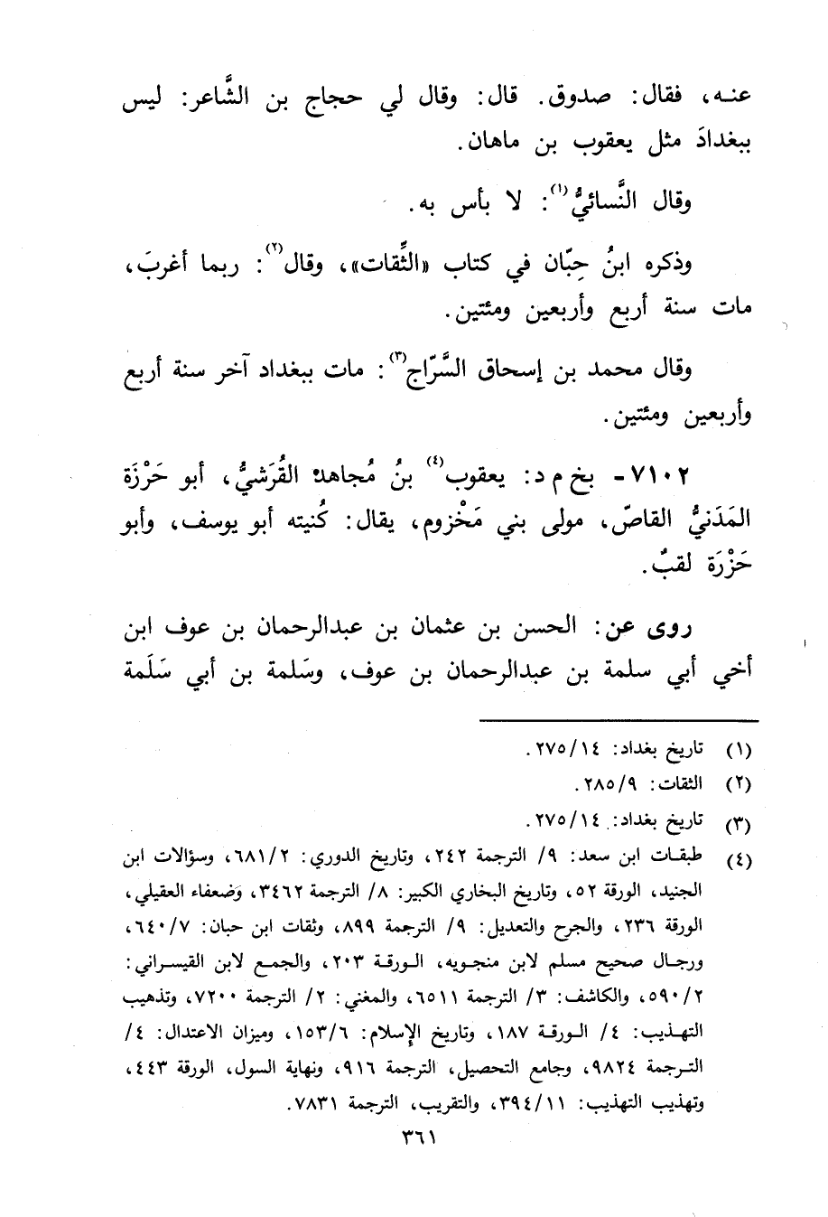 (4) طبقات ابن سعد: 9 / الترجمة 242، وتاريخ الدوري: 2 / 681، وسؤالات ابن الجنيد، الورقة 52، وتاريخ البخاري الكبير: 8 / الترجمة 3462، وضعفاء العقيلي، الورقة 236، والجرح والتعديل: 9 / الترجمة 899، وثقات ابن حبان: 7 / 640، ورجال صحيح مسلم لابن منجويه، الورقة 203، والجمع لابن القيسراني: 2 / 590، والكاشف: 3 / الترجمة 6511، والمغني: 2 / الترجمة 7200، وتذهيب التهذيب: 4 / الورقة 187، وتاريخ الاسلام: 6 / 153، وميزان الاعتدال: 4 / الترجمة 9824، وجامع التحصيل، الترجمة 916، ونهاية السول، الورقة 443، وتهذيب التهذيب: 11 / 394، والتقريب، الترجمة 7831.