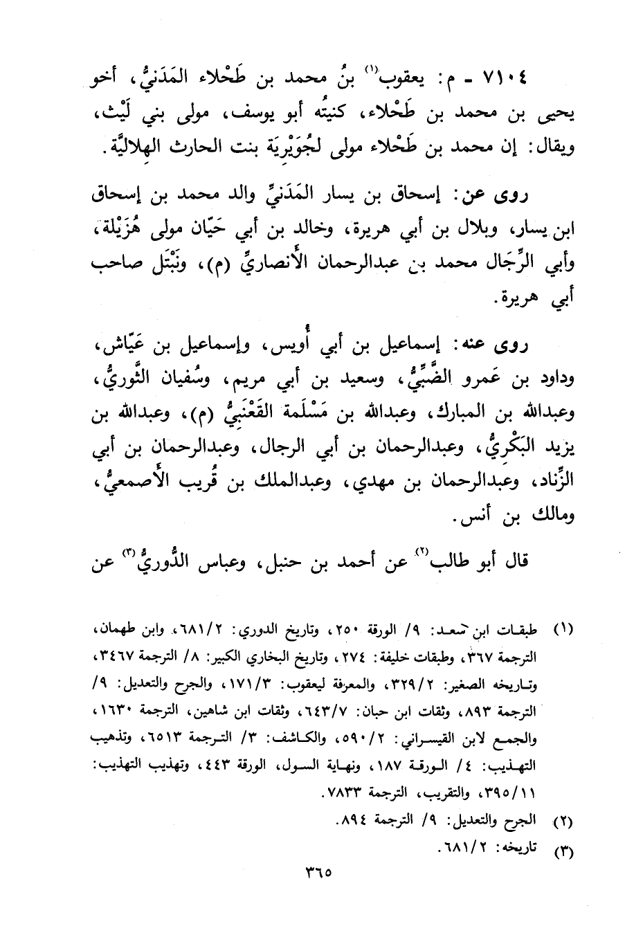 7104 - م: يعقوب بن مُحَمَّد بن طحلاء المدني (1) ، أخو يحيى بْن مُحَمَّد بْن طحلاء، كنيته أَبُو يوسف، مولى بني ليث، ويُقال: إن مُحَمَّد بْن طحلاء مولى لجويرية بنت الحارث الهلالية.