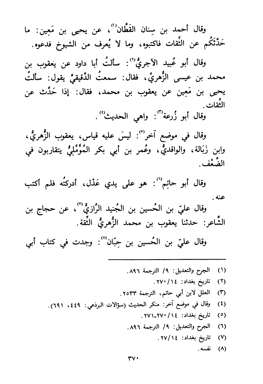 وَقَال فِي موضع آخر (5) : ليس عَلَيْهِ قياس، يعقوب الزُّهْرِيّ، وابن زبالة، والواقدي، وعُمَر بْن أَبي بكر المؤملي يتقاربون فِي الضعف.