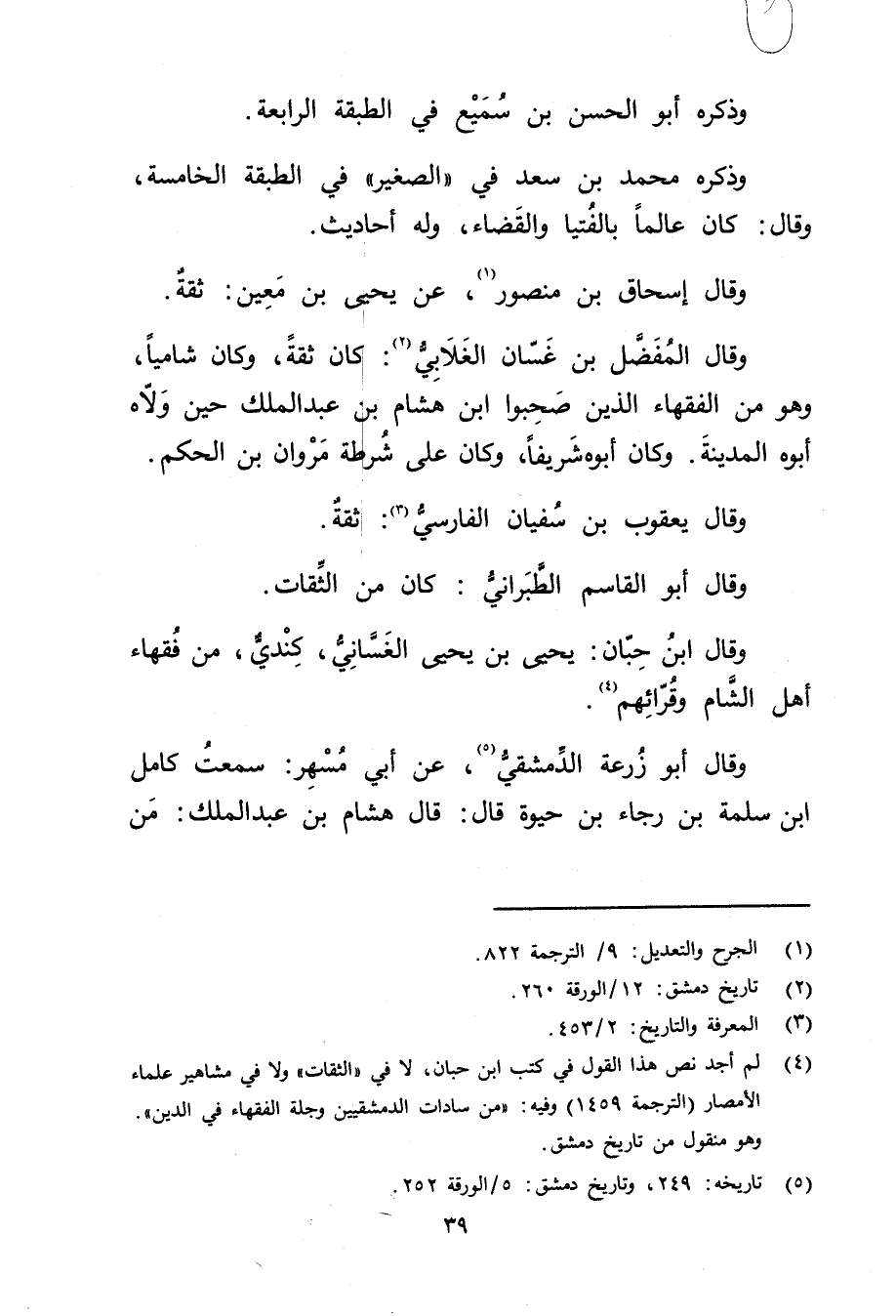 (4) لم أجد نص هذا القول في كتب ابن حبان، لا في "الثقات" ولا في مشاهير علماء الامصار (الترجمة 1459) وفيه: من سادات الدمشقيين وجلة الفقهاء في الدين". وهو منقول من تاريخ دمشق.
