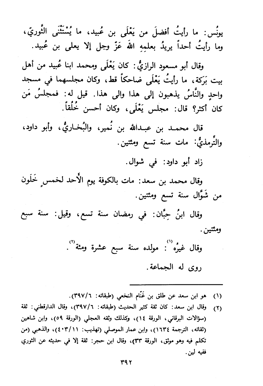 (2) وَقَال ابن سعد: كان ثقة كثير الحديث (طبقاته: 6 / 397) ، وَقَال الدَّارَقُطْنِيُّ: ثقة (سؤالات البرقاني، الورقة 14) ، وكذلك وثقه العجلي (الورقة 59) ، وابن شاهين (ثقاته، الترجمة 1634) ، وابن عمار الموصلي (تهذيب: 11 / 403) ، والذهبي (من تكلم فيه وهو موثق، الورقة 33) ، وَقَال ابن حجر: ثقة إلا في حديثه عن الثوري فقيه لين.