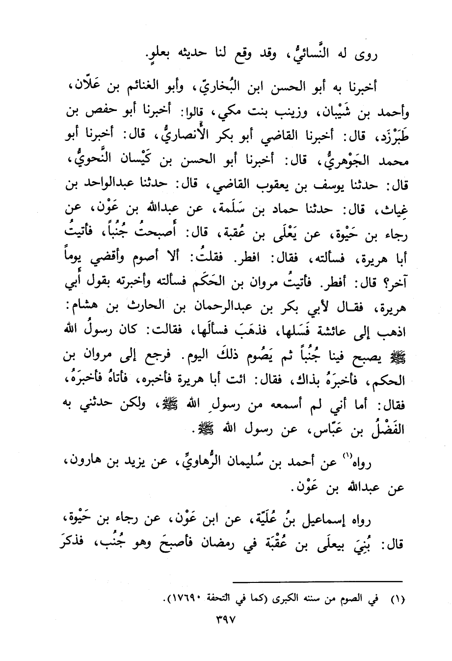 أخبرنا به أَبُو الحسن بْن البخاري، وأبو الغنائم بْن علان، وأحمد بْن شَيْبَانَ، وزَيْنَبُ بِنْتُ مَكِّيٍّ، قَالُوا: أخبرنا أبو حفص بن طَبَرْزَذَ، قال: أخبرنا الْقَاضِي أَبُو بَكْرٍ الأَنْصارِيّ، قال: أخبرنا أَبُو مُحَمَّدٍ الْجَوْهَرِيُّ، قال: أخبرنا أَبُو الْحَسَنِ بْنِ كَيْسَانَ النَّحْوِيُّ، قال: حَدَّثَنَا يُوسُفُ بْنُ يَعْقُوبَ الْقَاضِي، قال: حَدَّثَنَا عَبْد الْوَاحِدِ بْن غياث، قال: حَدَّثَنَا حماد بْن سلمة، عَنْ عَبد اللَّهِ بْنِ عون، عَنْ رجاء بْن حيوة، عَنْ يَعْلَى بْنِ عُقْبَةَ، قال: أَصْبَحْتُ جُنُبًا، فَأَتَيْتُ أَبَا هُرَيْرة، فَسَأَلْتُهُ، فَقَالَ: أَفْطِرْ. فَقُلْتُ: أَلا أَصُومُ وأَقْضِي يَوْمًا آخَرَ؟ قال: أَفْطِرْ. فَأَتَيْتُ مَرْوَانَ بْنَ الْحَكَمِ فَسَأَلْتُهُ وأَخْبَرْتُهُ بِقَوْلِ أَبِي هُرَيْرة، فَقَالَ لأبي بكر بن عَبْدِ الرَّحْمَنِ بْنِ الْحَارِثِ بْنِ هِشَامٍ: اذْهَبْ إِلَى عَائِشَةَ فَسَلْهَا، فَذَهَبَ فَسَأَلَهَا، فَقَالَتْ: كَانَ رَسُولُ اللَّهِ صَلَّى اللَّهُ عَلَيْهِ وسَلَّمَ يُصْبِحُ فِينَا جُنُبًا ثُمَّ يَصُومُ ذَلِكَ الْيَوْمِ. فَرَجَعَ إِلَى مَرْوَانَ بْنِ الْحَكَمِ، فَأَخْبَرَهُ بِذَاكَ، فَقَالَ: ائْتِ أَبَا هُرَيْرة فَأَخْبِرْهُ، فَأَتَاهُ فَأَخْبَرَهُ، فَقَالَ: أَمَا إِنِّي لَمْ أَسْمَعْهُ مِنْ رَسُول اللَّهِ صلى الله عليه وسلم، ولَكِنْ حَدَّثَنِي بِهِ الْفَضْلُ بْنِ عَبَّاسٍ، عَنْ رَسُولِ اللَّهِ صَلَّى اللَّهُ عَلَيْه وسَلَّمَ.