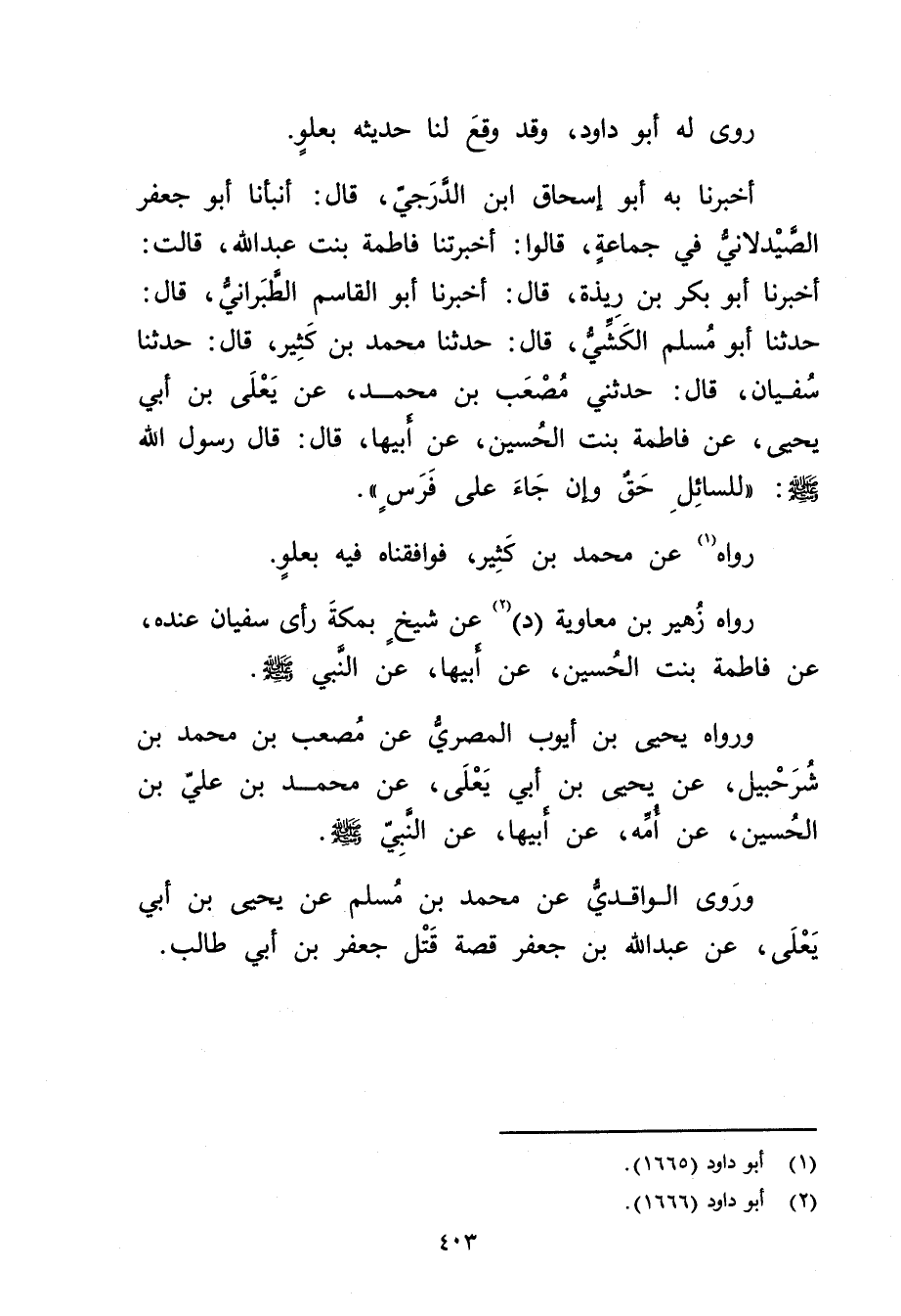 أَخْبَرَنَا بِهِ أَبُو إِسْحَاقَ ابْنُ الدَّرَجِيِّ، قال: أنبأنا أَبُو جَعْفَرٍ الصَّيْدَلانِيُّ فِي جَمَاعَةٍ، قَالُوا: أَخْبَرَتْنا فَاطِمَةُ بِنْتُ عَبد اللَّهِ، قَالَتْ: أخبرنا أَبُو بَكْرِ بْنُ رِيذَةَ، قال: أخبرنا أَبُو الْقَاسِمِ الطَّبَرَانِيُّ، قال: حَدَّثَنَا أَبُو مُسْلِمٍ الْكَشِّيُّ، قال: حَدَّثَنَا مُحَمَّدُ بْنُ كَثِيرٍ، قال: حَدَّثَنَا سُفْيَانُ، قال: حَدَّثَنِي مُصْعَبُ بْنُ مُحَمَّدٍ، عَنْ يَعْلَى بْنِ أَبي يَحْيَى، عَنْ فَاطِمَةَ بِنْتِ الْحُسَيْنِ، عَن أَبِيهَا، قال: قال رَسُولُ اللَّهِ صلى الله عليه وسلم: لِلسَّائِلِ حَقٌّ وإِنْ جَاءَ عَلَى فَرَسٍ.