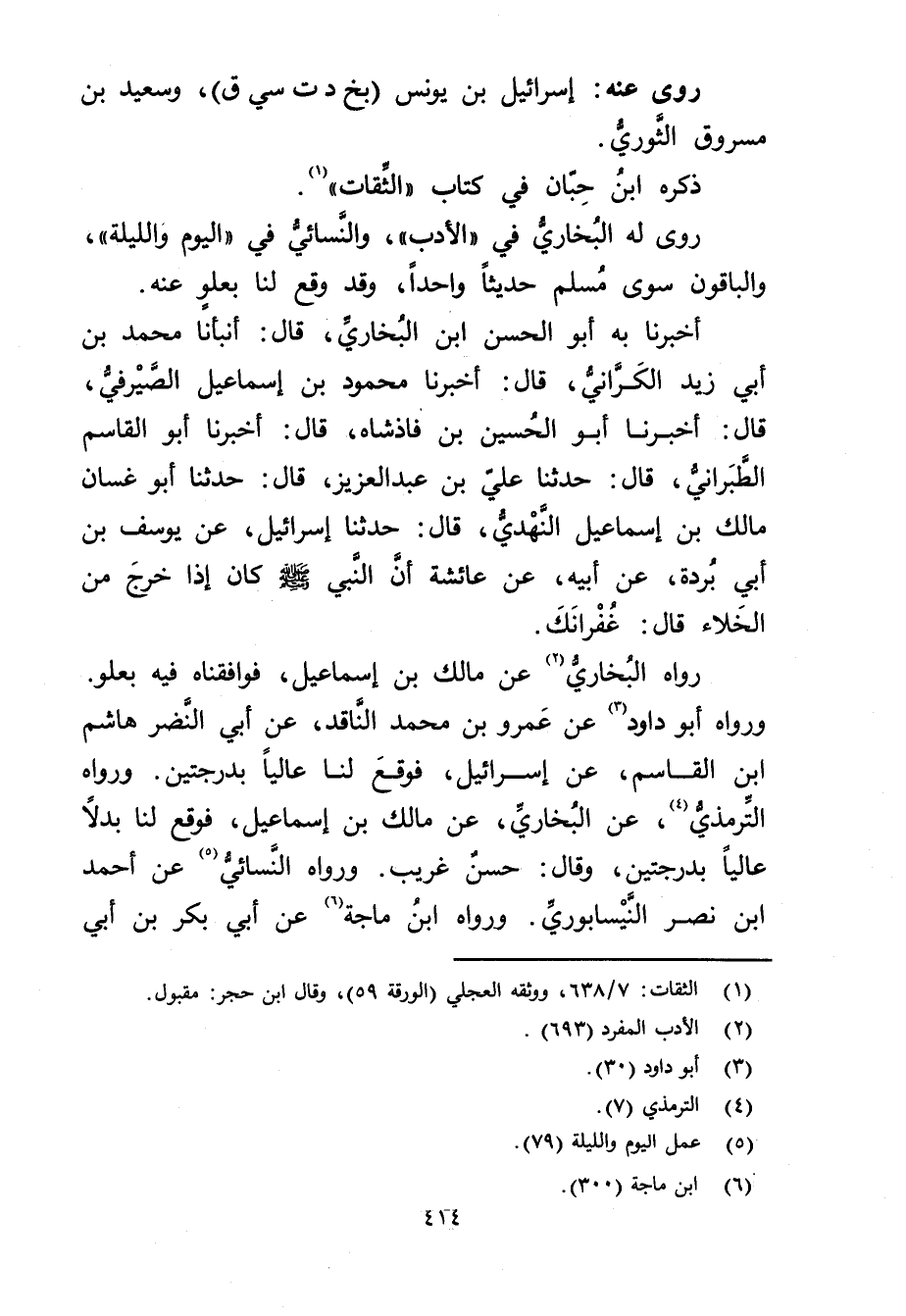 أَخْبَرَنَا بِهِ أَبُو الْحَسَنِ بْنُ الْبُخَارِيِّ، قال: أَنْبَأَنَا مُحَمَّدُ بْنُ أَبي زَيْدٍ الْكَرَّانِيُّ، قال: أَخْبَرَنَا مَحْمُودُ بْنُ إِسْمَاعِيلَ الصَّيْرَفِيُّ، قال: أخبرنا أَبُو الْحُسَيْنِ بْنُ فَاذْشَاهِ، قال: أخبرنا أَبُو الْقَاسِمِ الطَّبَرَانِيُّ، قال: حَدَّثَنَا علي بْن عبد العزيز، قال: حَدَّثَنَا أَبُو غَسَّانَ مَالِكُ بْنُ إِسْمَاعِيلَ النَّهْدِيُّ، قال: حَدَّثَنَا إِسْرَائِيلُ، عَنْ يُوسُفَ بْنِ أَبي بُرْدَةَ، عَن أَبِيهِ، عَنْ عَائِشَةَ أَنَّ النَّبِيَّ صلى الله عليه وسَلَّمَ كَانَ إِذَا خَرَجَ مِنْ الْخَلاءِ قال: غُفْرَانَكَ.