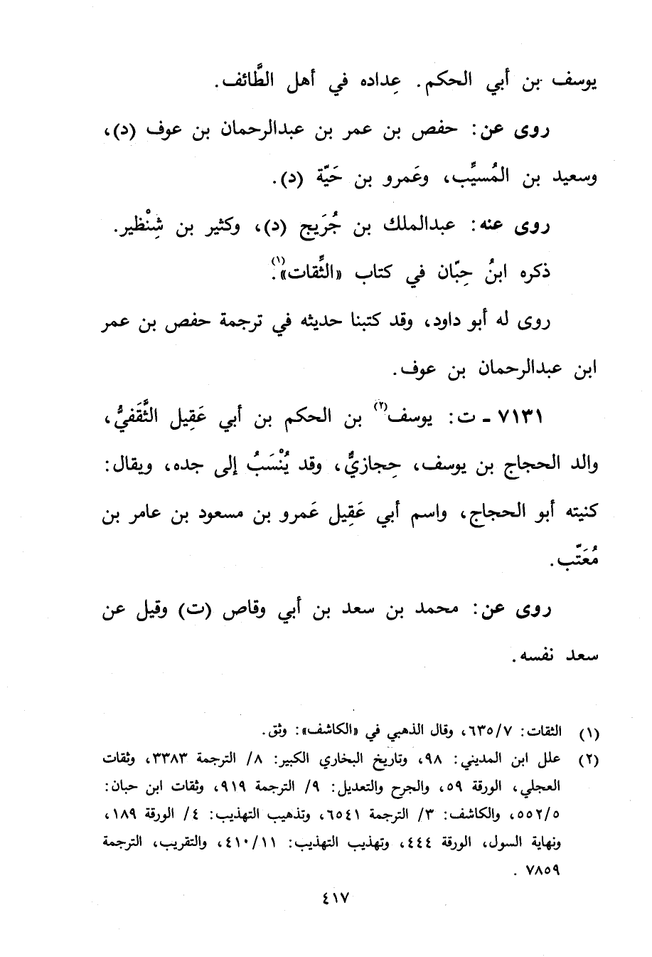 7131 - ت: يوسف بن الحكم بن أَبي عقيل الثقفي (2) ، والد الحجاج بْن يوسف، حجازي، وقد ينسب إلى جَدِّه، ويُقال: كنيته أَبُو الحجاج، واسم أَبِي عقيل عَمْرو بن مسعود بن عامر بن معتب.