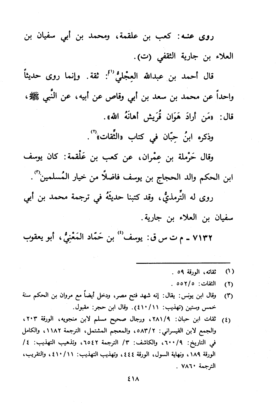 (4) ثقات ابن حبان: 9 / 281، ورجال صحيح مسلم لابن منجويه، الورقة 203، والجمع لابن القيسراني: 2 / 583، والمعجم المشتمل، الترجمة 1182، والكامل في التاريخ: 9 / 600، والكاشف: 3 / الترجمة 6542، وتذهيب التهذيب: 4 / الورقة 189، ونهاية السول، الورقة 444، وتهذيب التهذيب: 11 / 410، والتقريب، الترجمة 7860.