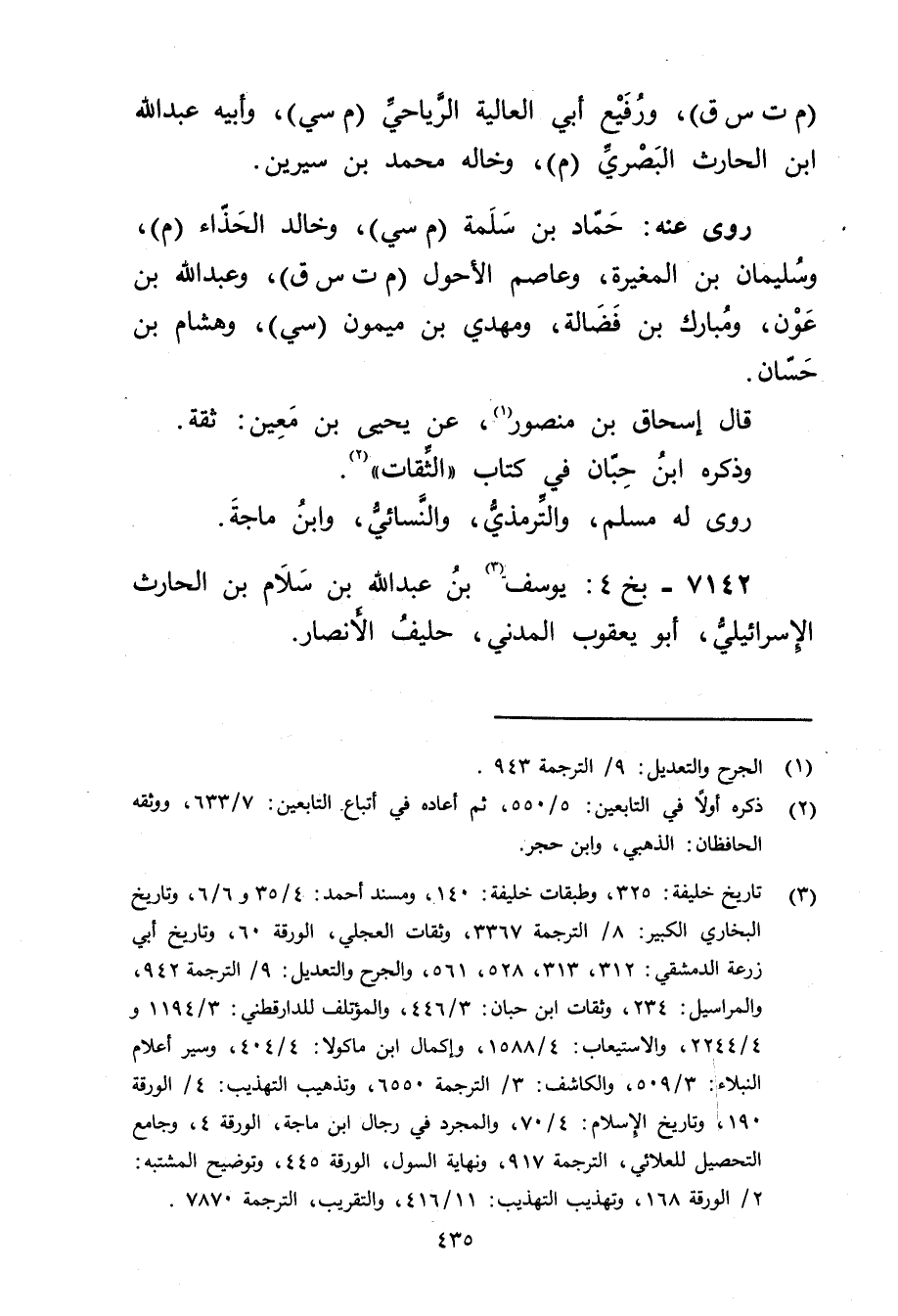 (3) تاريخ خليفة: 325، وطبقات خليفة: 140، ومسند أحمد: 4 / 35 و6 / 6، وتاريخ البخاري الكبير: 8 / الترجمة 3367، وثقات العجلي، الورقة 60، وتاريخ أبي زرعة الدمشقي: 312، 313، 528، 561، والجرح والتعديل: 9 / الترجمة 942، والمراسيل: 234، وثقات ابن حبان: 3 / 446، والمؤتلف للدارقطني: 3 / 1194 و4 / 2244، والاستيعاب: 4 / 1588، وإكمال ابن ماكولا: 4 / 404، وسير أعلام النبلاء: 3 / 509، والكاشف: 3 / الترجمة 6550، وتذهيب التهذيب: 4 / الورقة 190، وتاريخ الاسلام: 4 / 70، والمجرد في رجال ابن ماجة، الورقة 4، وجامع التحصيل للعلائي، الترجمة 917، ونهاية السول، الورقة 445، وتوضيح المشتبه: 2 / الورقة 168، وتهذيب التهذيب: 11 / 416، والتقريب، الترجمة 7870.