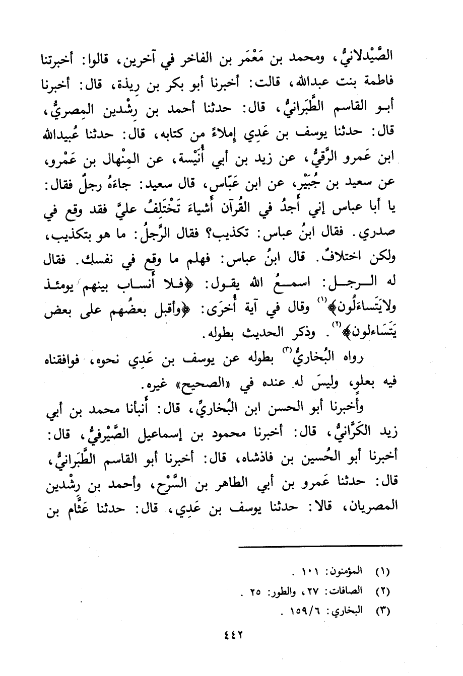 فَقَالَ ابْنُ عَبَّاسٍ: تَكْذِيبٌ؟ فَقَالَ الرَّجُلُ: مَا هُوَ بِتَكْذِيبٍ، ولَكِنِ اخْتِلافٌ. قال ابْنُ عَبَّاسٍ: فَهَلُمَّ مَا وقَعَ فِي نَفْسِكَ. فَقَالَ لَهُ الرَّجُلُ: اسْمَعَ اللَّهَ يَقُولُ: (فَلا أَنْسَابَ بَيْنَهُمْ يَوْمَئِذٍ ولا يَتَسَاءَلُونَ) (1) وَقَال فِي آيَةٍ أُخْرَى: (وأَقْبَلَ بَعْضُهُمْ عَلَى بَعْضٍ يَتَسَاءَلُونَ) (2) . وذَكَرَ الْحَدِيثَ بِطُولِهِ.