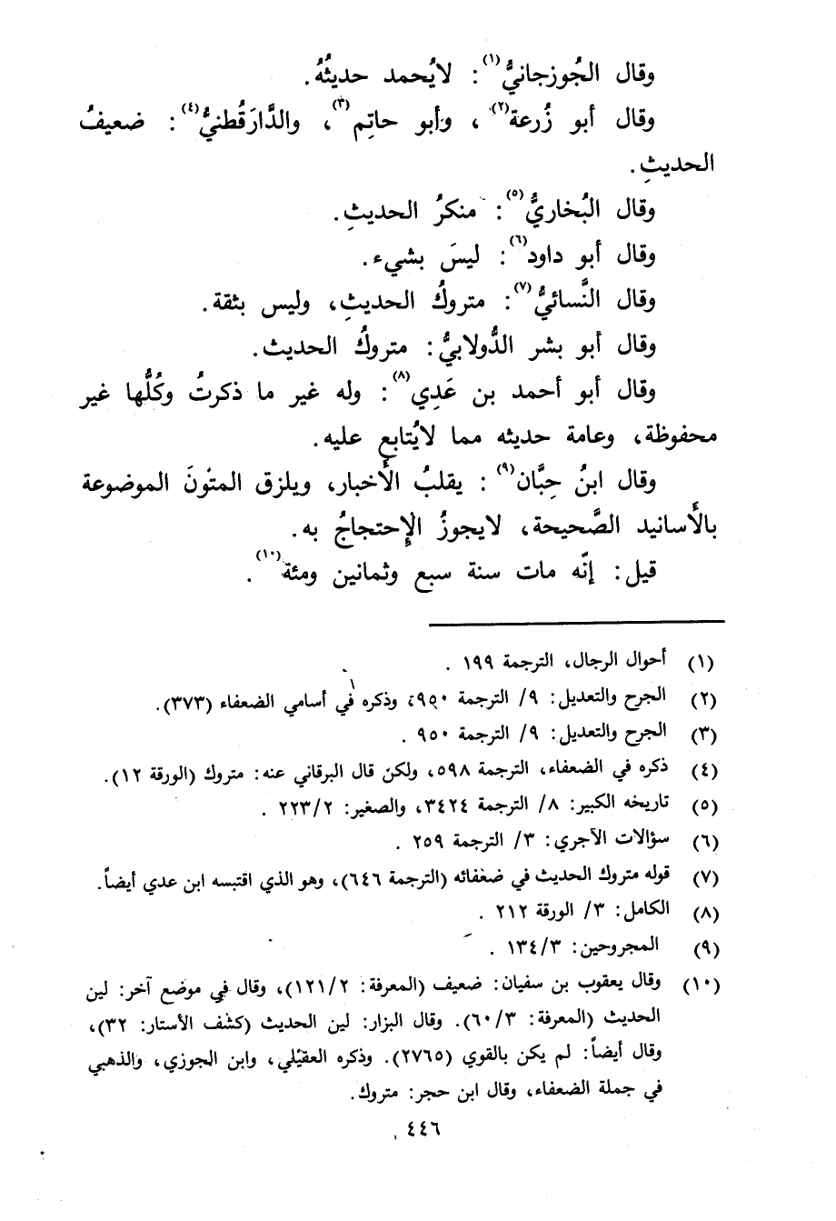 (7) قوله متروك الحديث في ضعفائه (الترجمة 646) ، وهو الذي اقتبسه ابن عدي أيضا.