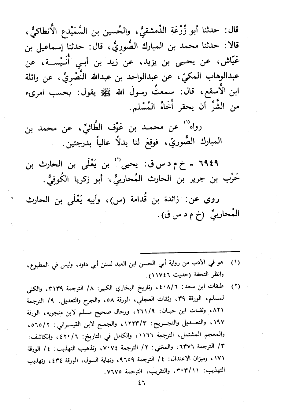 قال حَدَّثَنَا أَبُو زُرْعَة الدِّمَشْقِيُّ، والْحُسَيْنُ بْنُ السُّمَيْدَعِ الأَنْطَاكِيُّ، قَالا: حَدَّثَنَا مُحَمَّدُ بْنُ الْمُبَارَكِ الصُّورِيُّ، قال: حَدَّثَنَا إسماعيل بْن عياش، عَنْ يَحْيَى بْنِ يَزِيدَ، عَنْ زَيْد بْن أَبي أنيسة، عَن عَبْدِ الْوَهَّابِ الْمَكِّيِّ، عَنْ عَبْدِ الْوَاحِدِ بْن عَبد اللَّهِ النصري، عن واثلة ابن الأَسْقَعِ، قال: سَمِعْتُ رَسُولَ اللَّهِ صَلَّى اللَّهُ عَلَيْهِ وسَلَّمَ يقول: بِحَسْبِ امْرِئٍ مِنَ الشَّرِّ أَنْ يَحْقِرَ أَخَاهُ الْمُسْلِمَ.