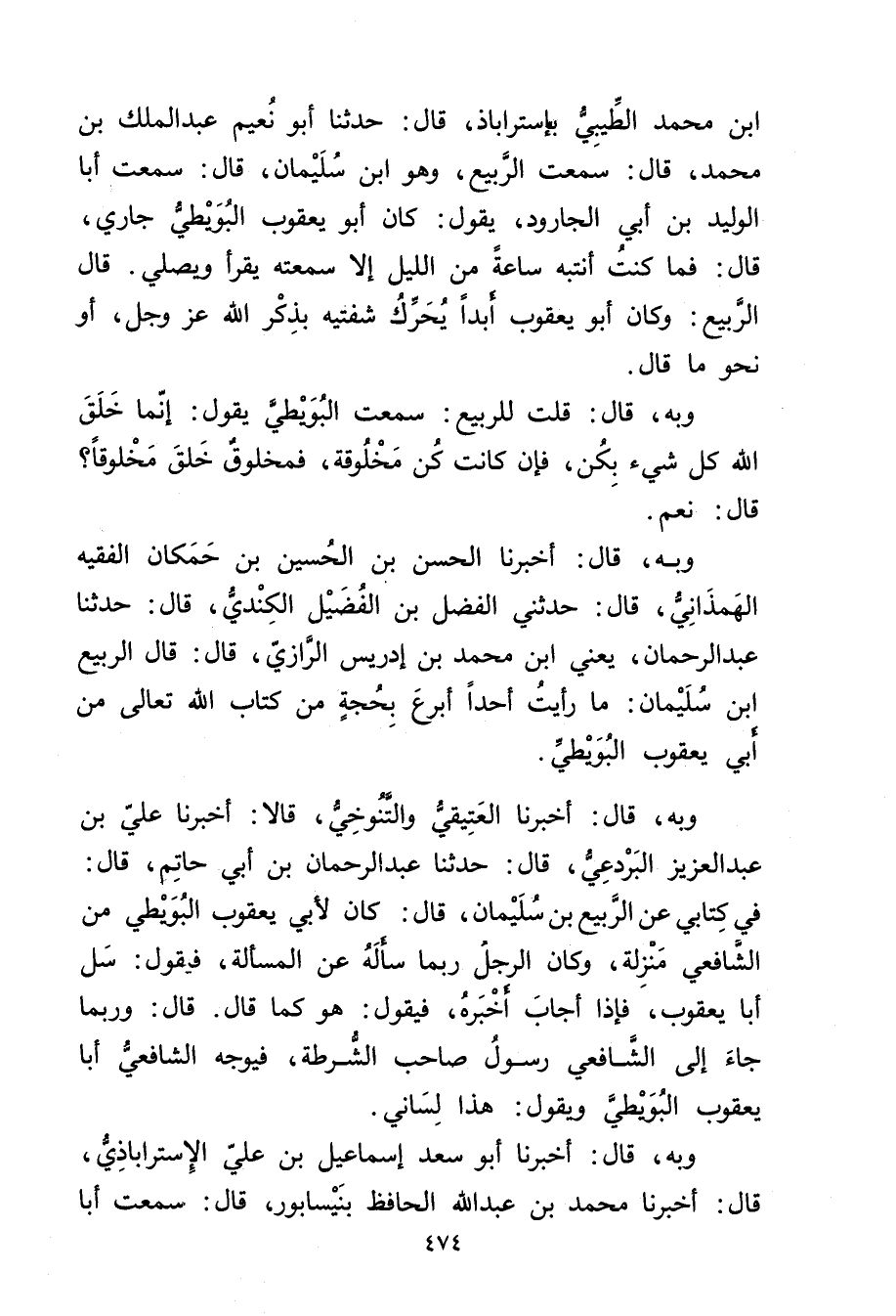 ابن مُحَمَّد الطيبي بإستراباذ، قال: حَدَّثَنَا أَبُو نُعَيْمٍ عَبد المَلِك بْنُ مُحَمَّد، قال: سمعت الربيع، وهو ابْن سُلَيْمان، قال: سمعت أَبَا الْوَلِيد بْن أَبي الجارود، يَقُول: كَانَ أَبُو يعقوب البويطي جاري، قال: فما كنت أنتبه ساعة من الليل إلا سمعته يقرأ ويصلي. قال الربيع: وكان أَبُو يعقوب أبدا يحرك شفتيه بذكر الله عزوجل، أو نحو ما قال.