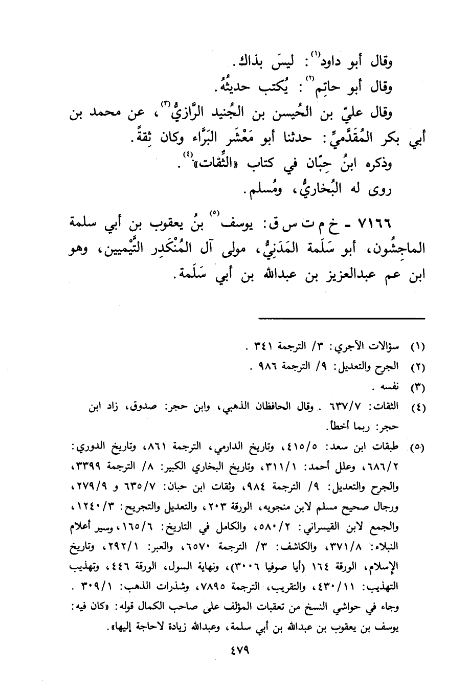 (5) طبقات ابن سعد: 5 / 415، وتاريخ الدارمي، الترجمة 861، وتاريخ الدوري: 2 / 686، وعلل أحمد: 1 / 311، وتاريخ البخاري الكبير: 8 / الترجمة 3399، والجرح والتعديل: 9 / الترجمة 984، وثقات ابن حبان: 7 / 635 و9 / 279، ورجال صحيح مسلم لابن منجويه، الورقة 203، والتعديل والتجريح: 3 / 1240، والجمع لابن القيسراني: 2 / 580، والكامل في التاريخ: 6 / 165، وسير أعلام النبلاء: 8 / 371، والكاشف: 3 / الترجمة 6570، والعبر: 1 / 292، وتاريخ الاسلام، الورقة 164 (أيا صوفيا 3006) ، ونهاية السول، الورقة 446، وتهذيب التهذيب: 11 / 430، والتقريب، الترجمة 7895، وشذرات الذهب: 1 / 309. وجاء في حواشي النسخ من تعقبات المؤلف على صاحب الكمال قوله: كان فيه: يوسف بن يعقوب بن عَبد الله بن أَبي سلمة، وعَبد الله زيادة لا حاجة إليها".