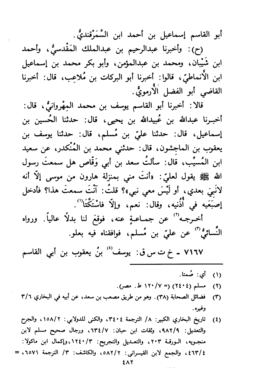 قَالا: أخبرنا أَبُو الْقَاسِمِ يُوسُفُ بْنُ مُحَمَّدِ الْمِهْرَوَانِيُّ، قال: أخبرنا عَبد اللَّهِ بْن عُبَيد الله بْن يحيى، قال: حَدَّثَنَا الْحُسَيْنُ بْنُ إِسْمَاعِيلَ، قال: حَدَّثَنَا عَلِيُّ بْنُ مسلم، قال: حَدَّثَنَا يُوسُفُ بْنُ يَعْقُوبَ بْنِ الْمَاجِشُونَ، قال: حَدَّثَنِي مُحَمَّدُ بن المنكدر، عن سَعِيد ابن المُسَيَّب، قال: سَأَلْتُ سَعْدَ بْنَ أَبي وقَّاصٍ هَلْ سَمِعْتَ رَسُولَ اللَّهِ صلى الله عليه وسلم يَقُولُ لِعَلِيٍّ: أَنْتَ مِنِّي بِمَنْزِلَةِ هارون من موسى إلا أنه لا نَبِيَّ بَعْدِي، أَوْ لَيْسَ مَعِيَ نَبِيٌّ"؟ قُلْتُ: أَنْتَ سَمِعْتَ هَذَا؟ فَأَدْخَلَ أُصْبُعَيْهِ فِي أُذُنَيْهِ، وَقَال: نَعَمْ، وإِلا فَاسْتَكَّتَا (1) .