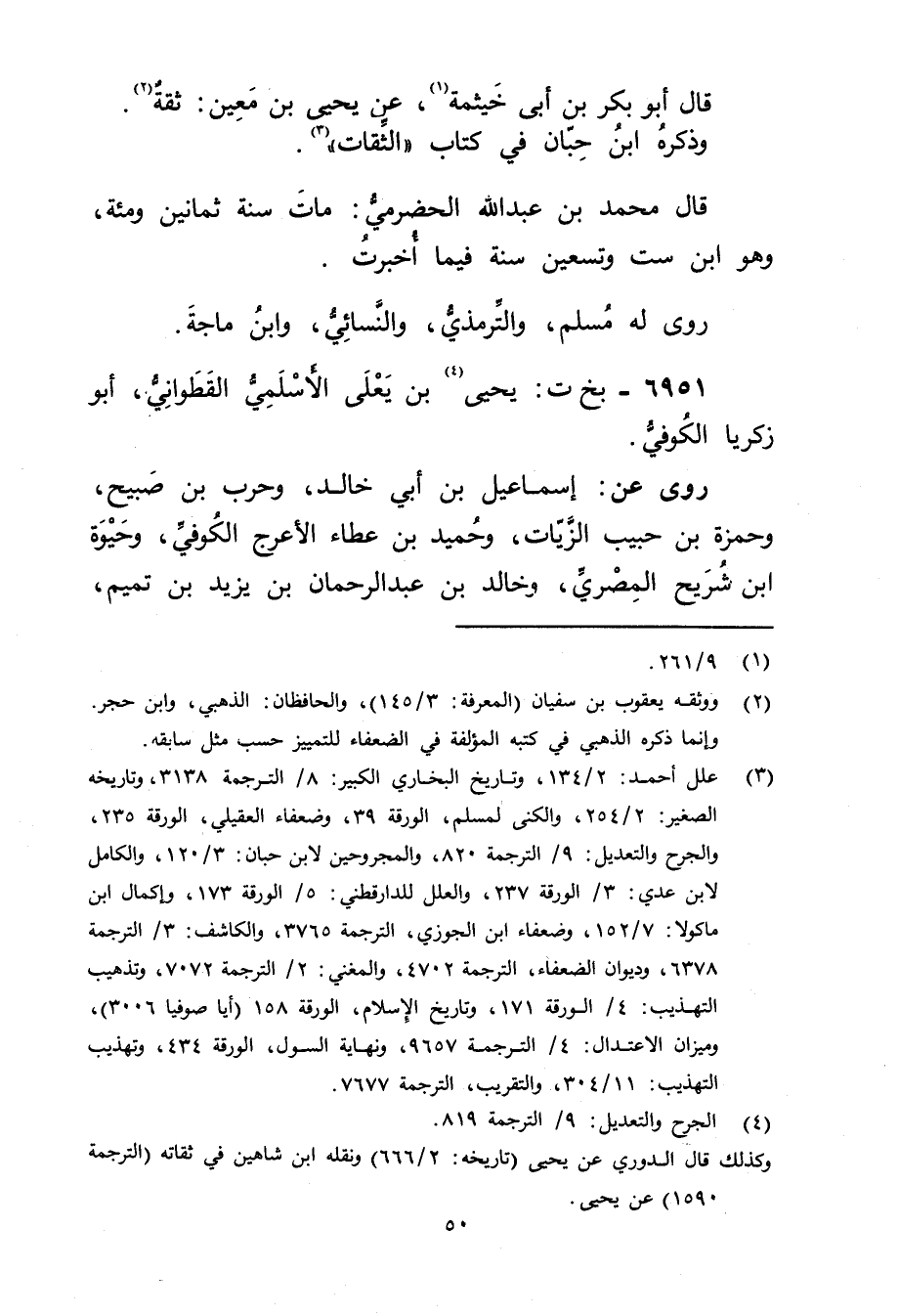 (4) الجرح والتعديل: 9 / الترجمة 819. وكذلك قال الدوري عن يحيى (تاريخه: 2 / 666) ونقله ابن شاهين في ثقاته (الترجمة 1590) عن يحيى.