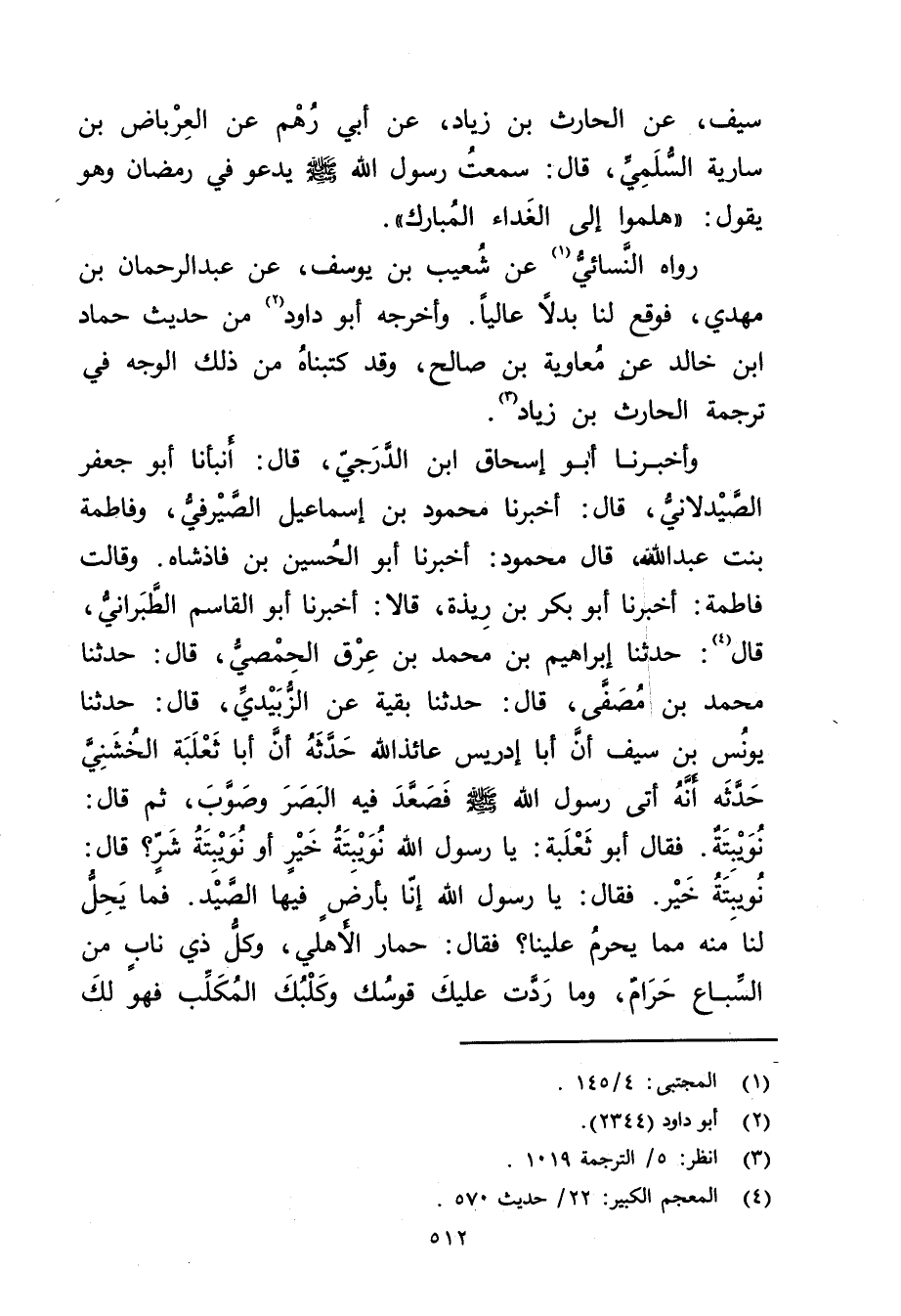 وأَخْبَرَنَا أَبُو إِسْحَاقَ ابْنُ الدَّرَجِيِّ، قال: أنبأنا أَبُو جَعْفَرٍ الصَّيْدَلانِيُّ، قال: أَخْبَرَنَا مَحْمُودُ بْنُ إِسْمَاعِيلَ الصَّيْرَفِيُّ، وفَاطِمَةُ بِنْتُ عَبد اللَّهِ، قال محمود: أخبرنا أبو الحسين بْنِ فَاذْشَاهِ. وَقَالت فَاطِمَةُ: أخبرنا أَبُو بَكْرِ بْنُ رِيذَةَ، قَالا: أخبرنا أَبُو الْقَاسِمِ الطَّبَرَانِيُّ، قال (4) : حَدَّثَنَا إِبْرَاهِيمُ بْنُ مُحَمَّدِ بْنِ عِرْقٍ الْحِمْصِيُّ، قال: حَدَّثَنَا مُحَمَّدُ بْنُ مُصَفَّى، قال: حَدَّثَنَا بَقِيَّةُ عَنِ الزُّبَيْدِيِّ، قال: حَدَّثَنَا يُونُسُ بْنُ سَيْفٍ أَنَّ أَبَا إِدْرِيسَ عَائِذَ اللَّهِ حَدَّثَهُ أَنَ أَبَا ثَعْلَبَةَ الْخُشَنِيَّ حَدَّثَهُ أَنَّهُ أَتَى رَسُول اللَّهِ صلى الله عليه وسلم فَصَعَّدَ فِيهِ الْبَصَرَ وصَوَّبَ، ثُمَّ قال: نُوَيْبِتَةُ. فَقَالَ أَبُو ثَعْلَبَةَ: يَا رَسُولَ اللَّهِ نُوَيْبِتَةُ خَيْرٍ أَوْ نُوَيْبِتَةُ شَرٍّ؟ قال: نُوَيْبِتَةُ خَيْرٍ. فَقَالَ: يَا رَسُولُ اللَّهِ إِنَّا بِأَرْضٍ فِيهَا الصَّيْدُ. فَمَا يَحِلُّ لَنَا مِنْهُ مِمَّا يَحْرُمُ عَلَيْنَا؟ فَقَالَ: حِمَارُ الأَهْلِيِّ، وكُلَّ ذِي نَابٍ مِنَ السِّبَاعِ حَرَامٌ، ومَا رَدَّتْ عَلَيْكَ قَوْسُكَ وكلبك المكلب فهو لك