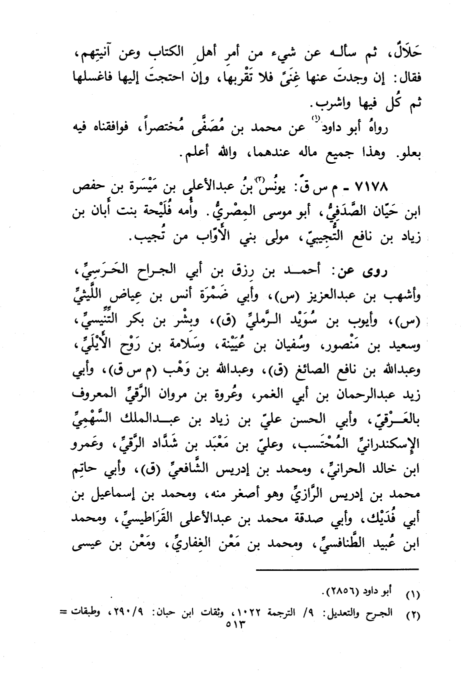 7178 - م س ق: يونس بن عبد الاعلى بن ميسرة بن حفص ابن حيان الصدفي (2) ، أَبُو موسى المِصْرِي. وأمه فليحة بنت أبان بْن زياد بْن نافع التجيبي، مولى بْني الأواب من تجيب.